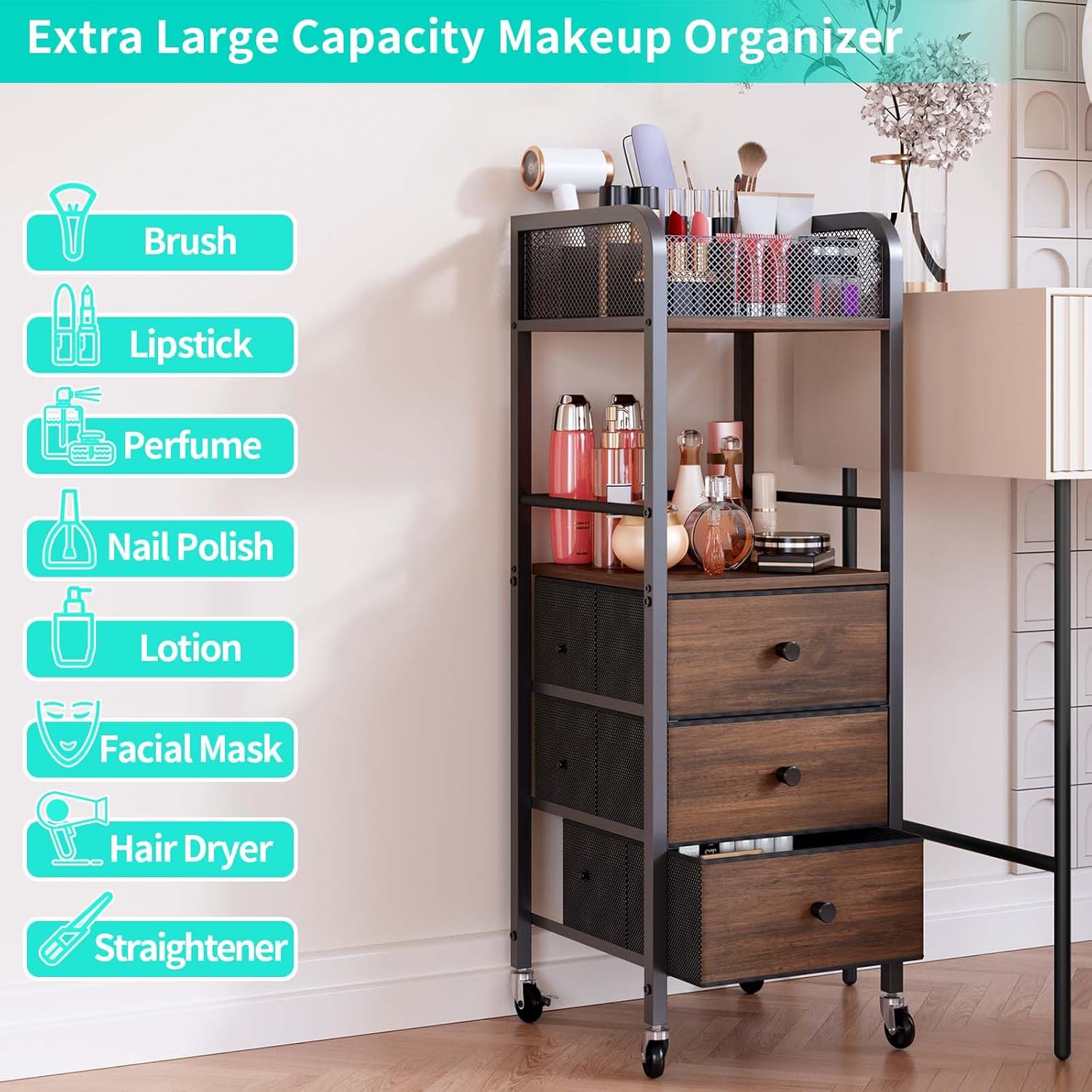 HapiRm Rolling Makeup Cart Organizer - Floor Skincare Make Up Storage with 3 Drawers, Vanity Organizer Cosmetic Display Cases Holder for Skin Care Perfume Nail Polish Brush Hair Tool