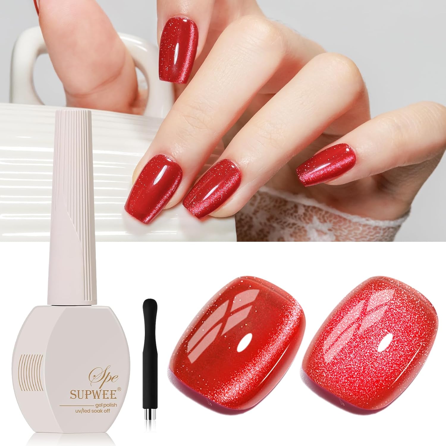 - Smoothie Cat Eye Gel Polish: 1*15ml(0.5fl oz) red cat eye gel nail polish with 1PC magnetic stick. Mixed with smoothie magnetic glitter, it's perfect for making a statement
