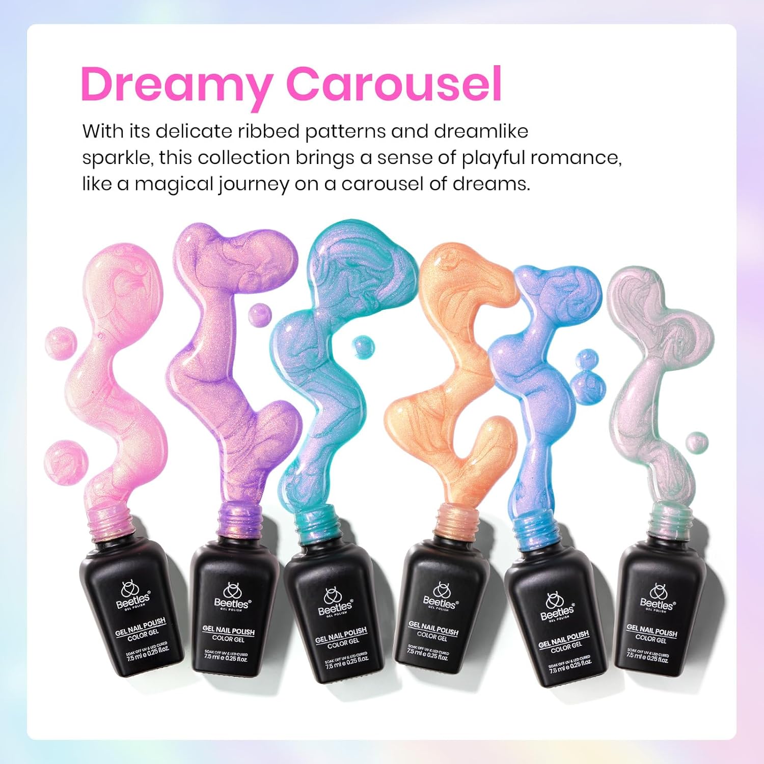 - Beetles Mermaid Collection Gel Polish Set Dreamy Carousel : The package includes 6pcs 7.5ML/ 0.25fl oz summer gel polish with mermaid unique design. This is 2-in-1 summer gel polish,not only can be pearl gel polish but also can be swirl thread nail gel. Color Number: f633-f634-f635-f636-f637-f638