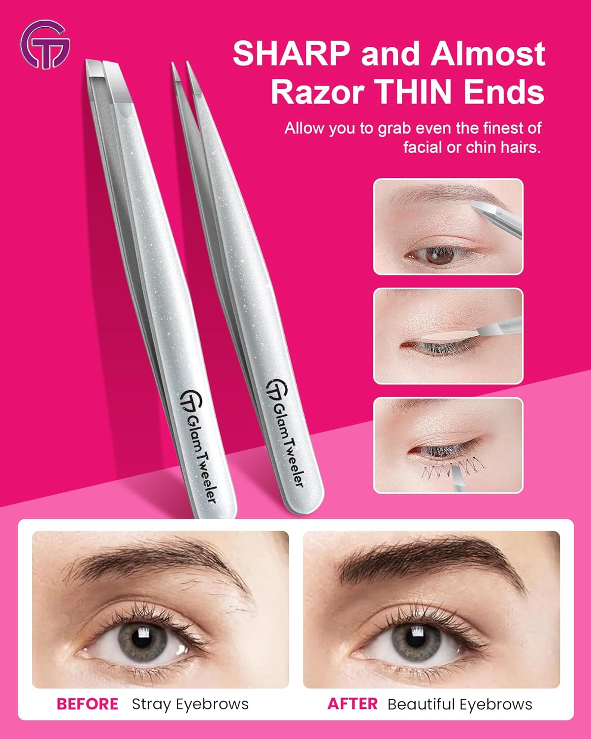 Expert Slant and Point Tip Tweezer Set with Exclusive Storage & Carrying Case, GlamTweeler Sharp & Precision Tweezer Set for Eyebrows, Facial Hairs and Fine Hairs Removal (Sparkle Silver)