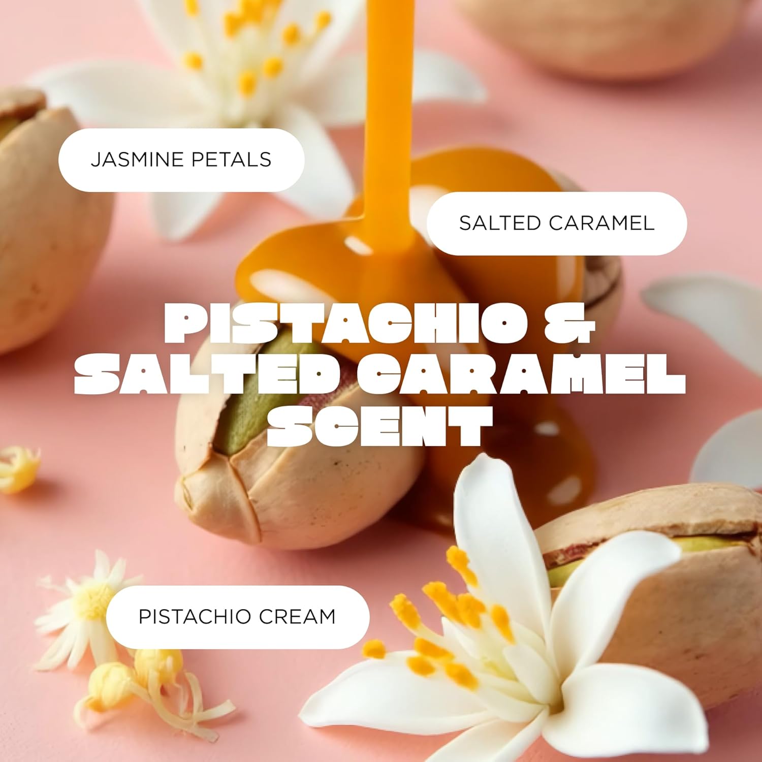 - PISTACHIO & SALTED CARAMEL SCENT: Top Notes: pistachio cream, almond white peach | Middle notes: jasmin petals, tiger lily freesia | Bottom Notes: vanilla, salted caramel
