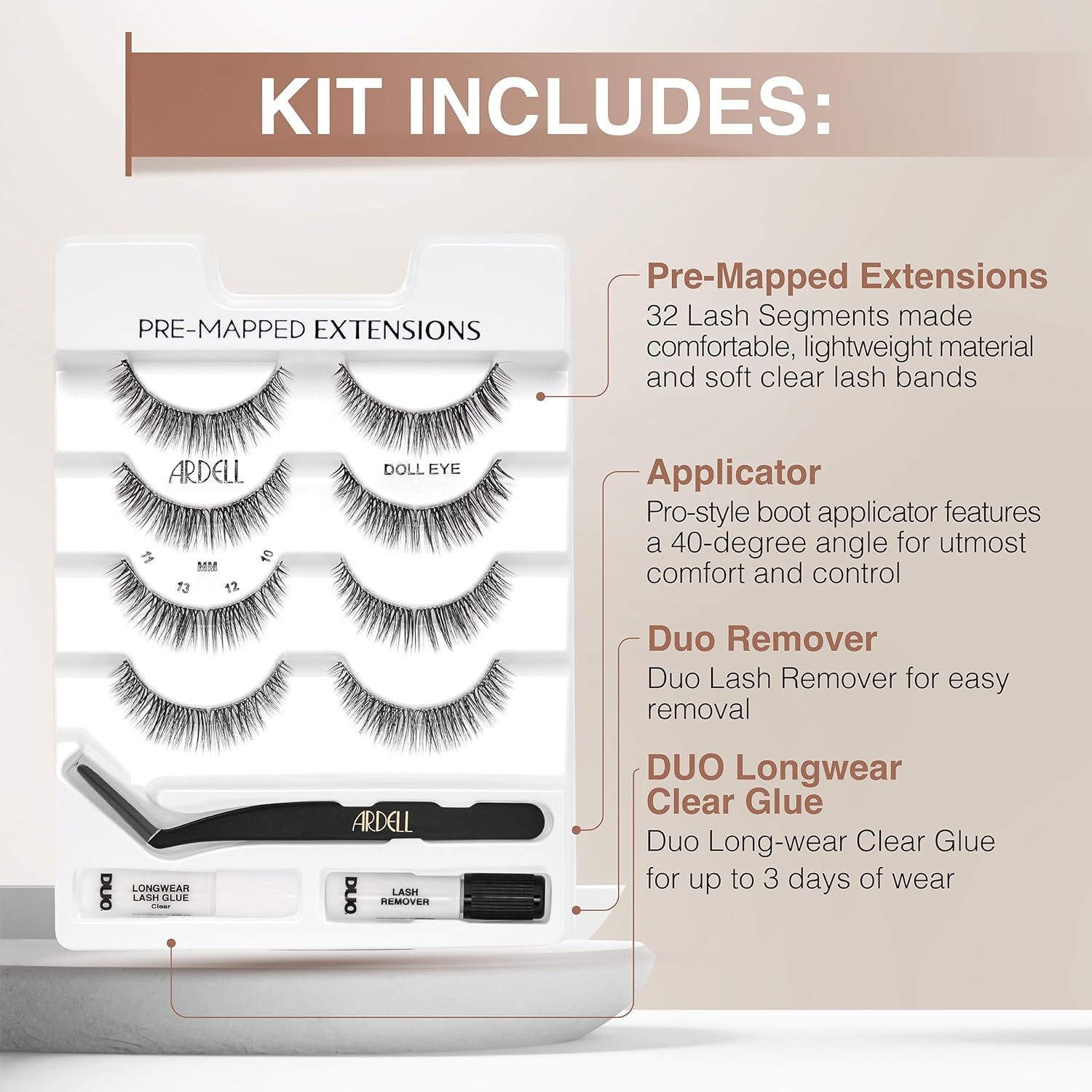 Ardell Pre-Mapped Eyelash Extensions Kit - False Lashes Doll Eye, Reusable Segmented Lash Strips, Long-Lasting with Lash Glue and Remover, 4 Pack