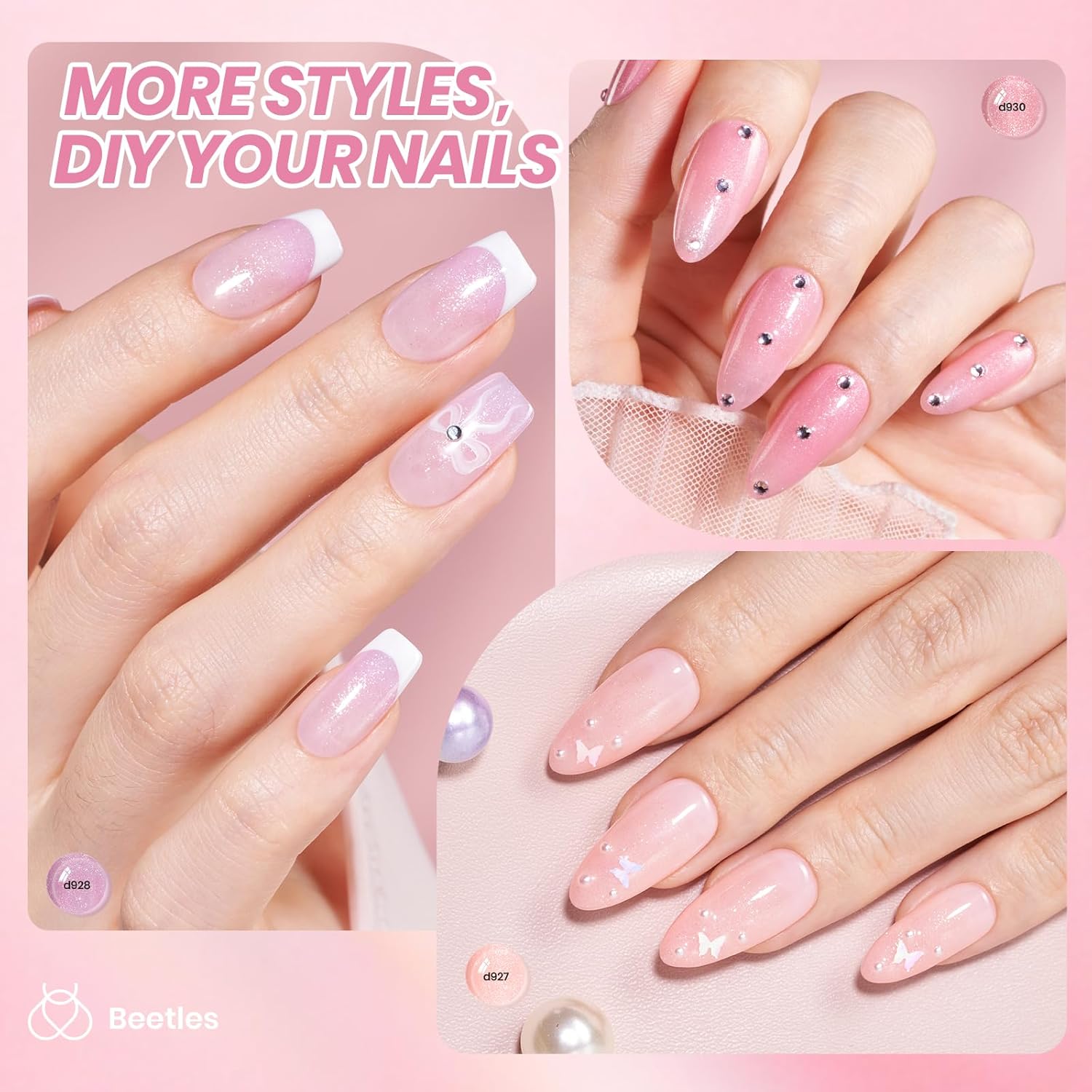 - 【Glitter Jelly Pink Styles】Beetles Selfless Love 7.5ml*6 Shimmer Nude Glitter Pink Jelly Gel Nail Polish kit is an ESSENTIAL for everyone! Beetles well-selected 6 colors glitter pink gel nail polish set, show the girl's romantic and elegant temperament. Make it easy for you to create elegant French nail art.