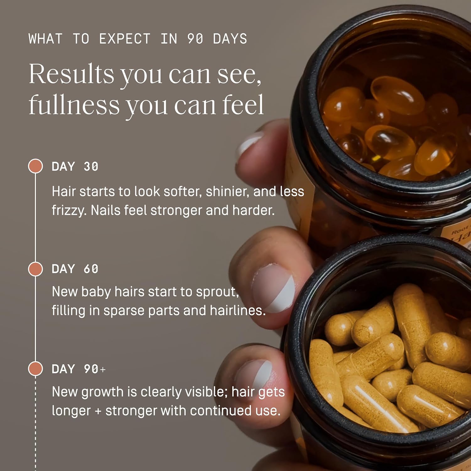 - SEE VISIBLE RESULTS IN 30 DAYS: Hair starts to look softer, shinier, and less frizzy. At 60 days, new baby hairs start to sprout, filling in sparse parts. At day 90, strong new growth is clearly visible.