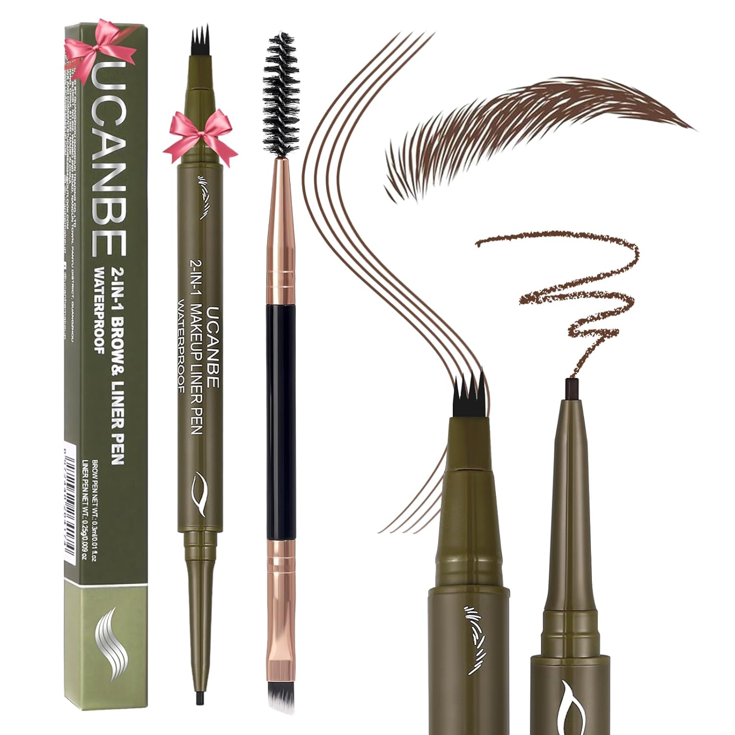 - 【Dual-Ended Eyebrow Pen & Gel Liner Pencil + Dual-Ended Spoolie Brush Set】UCANBE Innovative 2-in-1 eyebrow pen features eyebrow pencils for women with 4 micro-fork tips on one end to effortlessly fill colors in brow gaps and draw natural hair-like strokes, and on the other end, a gel eyeliner pencil with creamy formula glides on easily to create subtle lines, precise definition, intensely smokey vibes and custom brow & eyeline makeup looks. And the included brow spoolie brush assist with shape and spread the eyebrow colors evenly so as to achieve natural beautiful hair-like strokes!