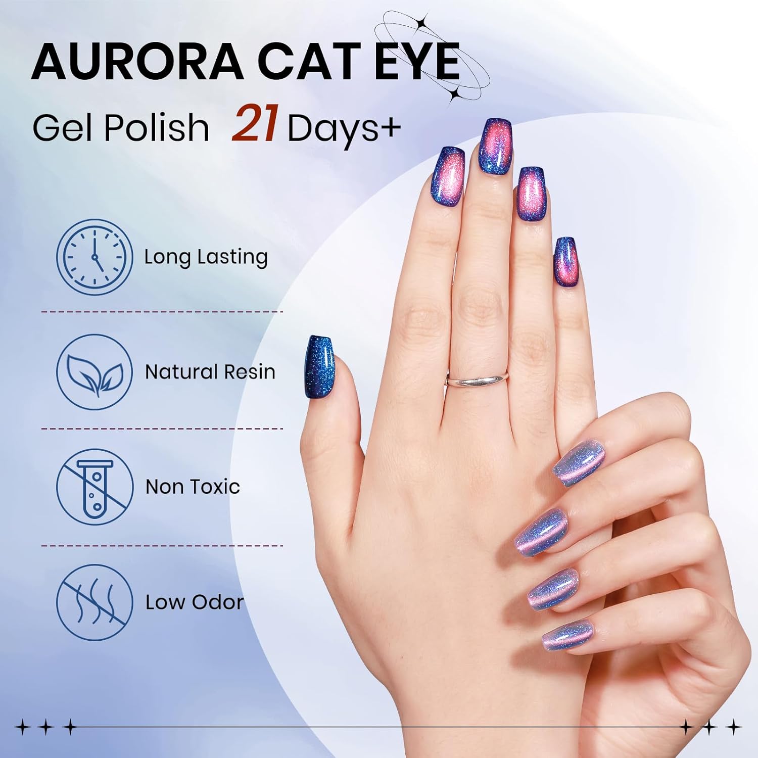 - Aurora Cat Eye Gel Polish: 1*15ml(0.5fl oz) aurora blue cat eye gel nail polish with 1pc magnetic stick. Suitable for all occasions to wear, both daily and special occasions can show a unique style