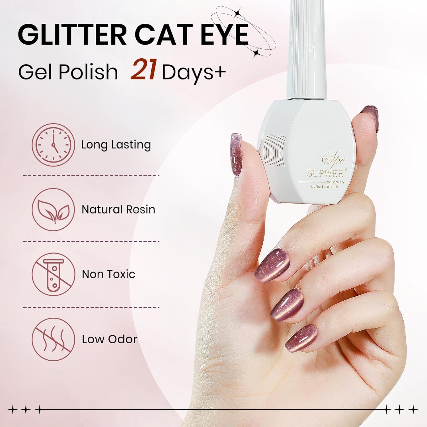- Star Diamond Cat Eye Gel Polish: 1*15ml(0.5fl oz) brown cat eye gel nail polish with 1PC magnetic stick. Mixed with smoothie magnetic glitter, it's perfect for making a statement