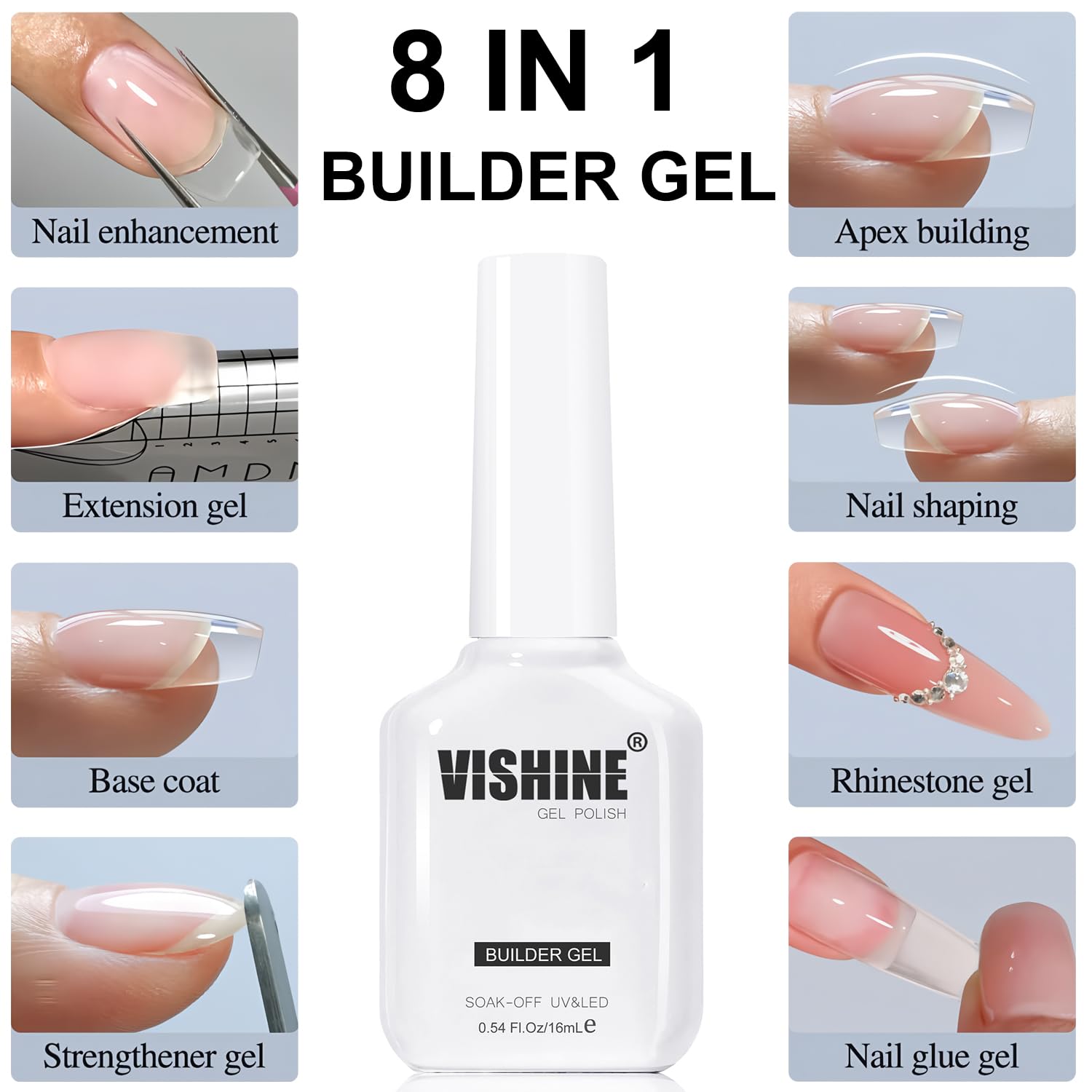 Vishine 2 Pcs Clear Builder Gel 8-in-One Clear Gel Builder for Nail Thickening Natural Nails Transparent Extension Hard Gel Polish Rhinestone Glue for Nail Art Base Coat Needed 16ml