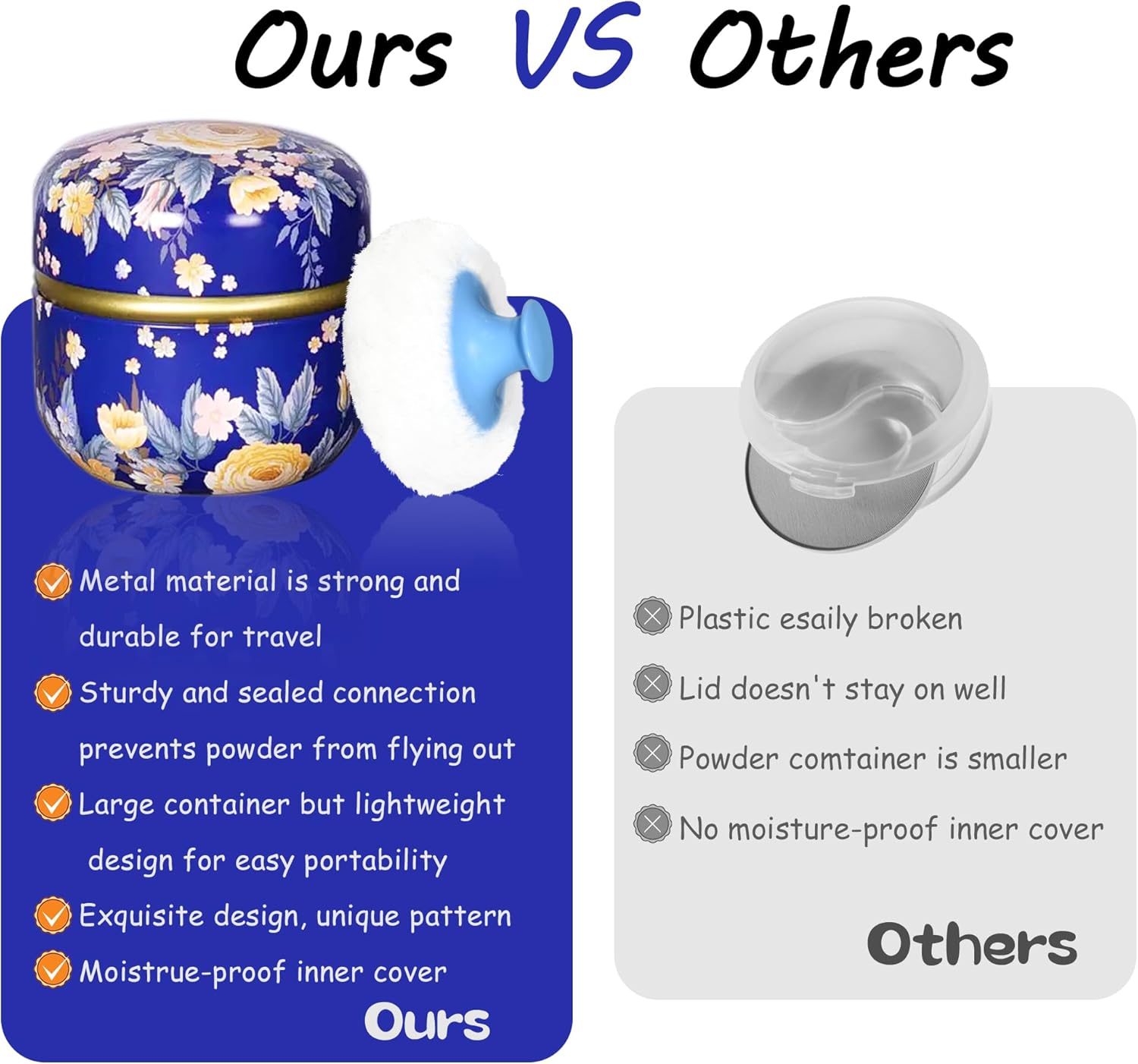 - The powder box has a delicate appearance and a variety of patterns for you to choose. The powder box is made of high-quality tinplate, which are not easy to break after being dropped, and not fade easily, and can be used for a long time. There is also a lid inside the powder box, so you don't have to worry about spilling powder.
