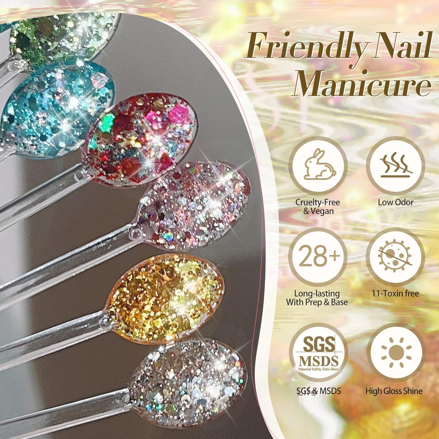 - [We Care for You]: Glitter Sequins in gel nail polish may settle over time; Before use, please remember to stir or shake it thoroughly; Different light sources, monitors and coating owns different color shades