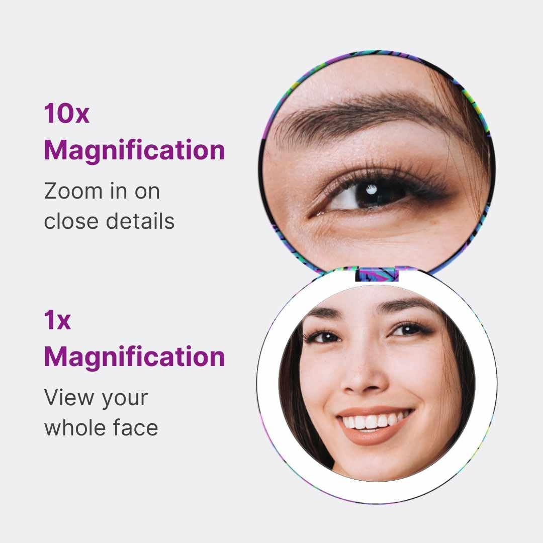 - Double-sided magnification (1x and 10x) so you can apply a full face of makeup, do a quick touch-up on the go, or focus on a detailed task like tweezing or inserting contact lenses