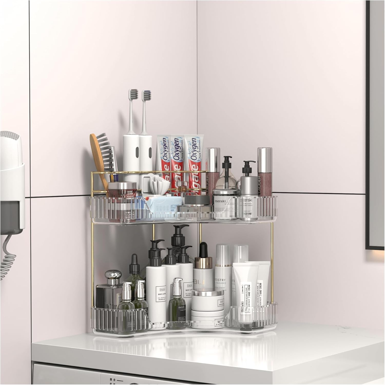 Makeup Organizer Countertop 2 Tier, Corner Bathroom Countertop Organizer with Toothbrush and Makeup Brush Holder, Corner Vanity Tray for Skincare Organization