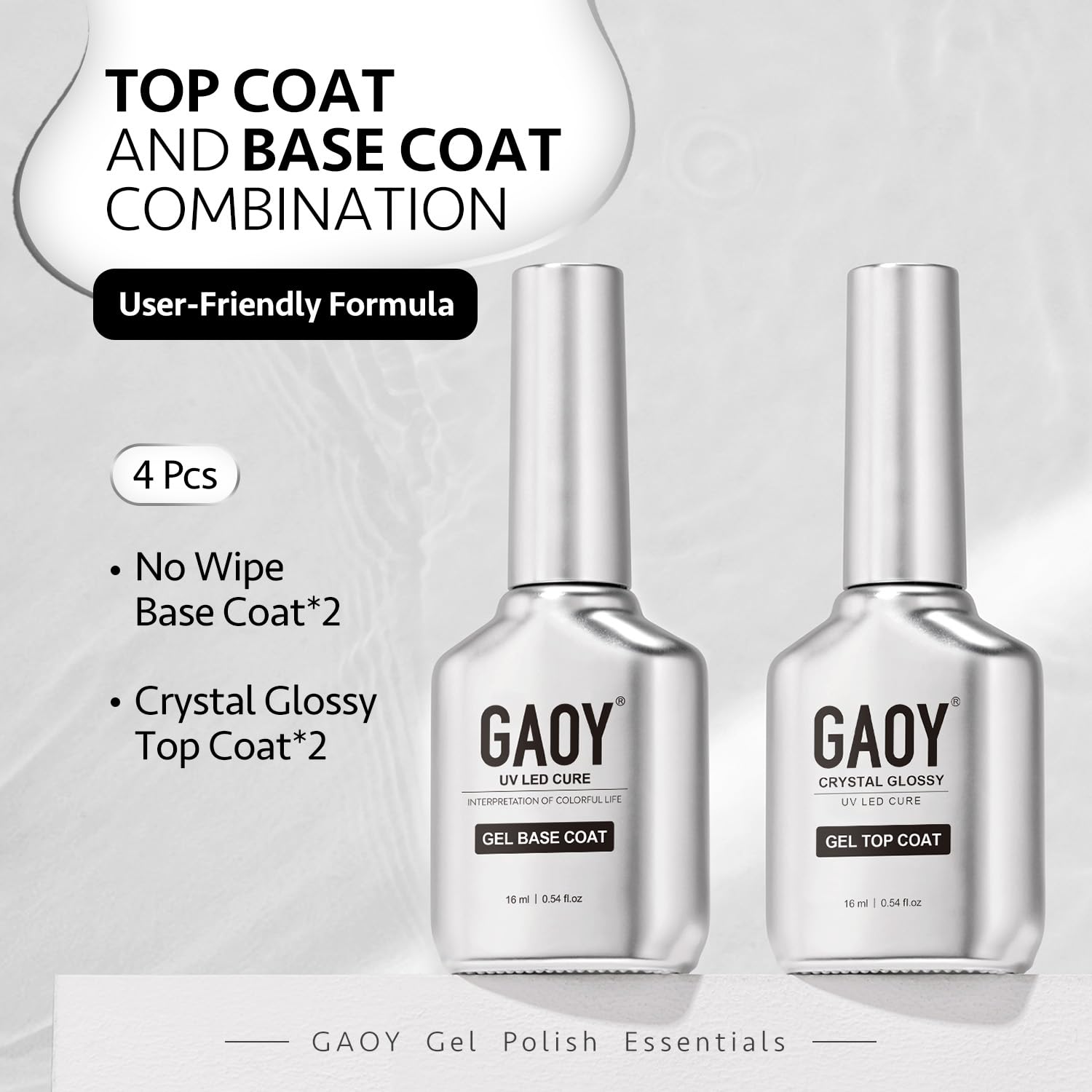 GAOY 16ml 4 Pcs Glassy Gel Top Coat and Base Coat Set, No Wipe Foundation Combination for UV Light Cure Nail Polish