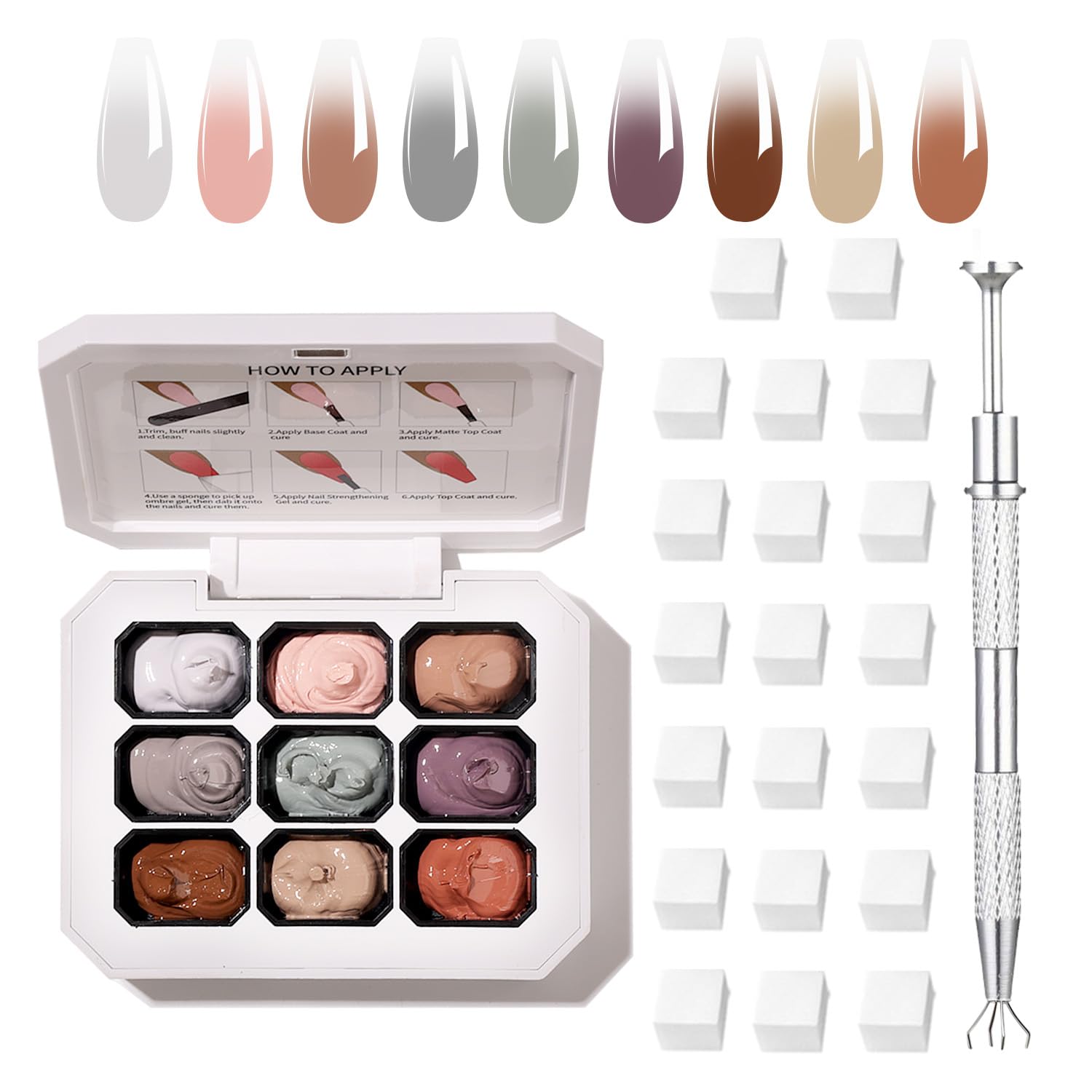 - [One-stop gradient nail art kit]:ombre gel nail polish kit contains professional gradient Ombre Gel in 9-color gel polish palette and special Nail Sponges, Claws Metal Grabber, easy to achieve the entire process from basic painting to gradual blending
