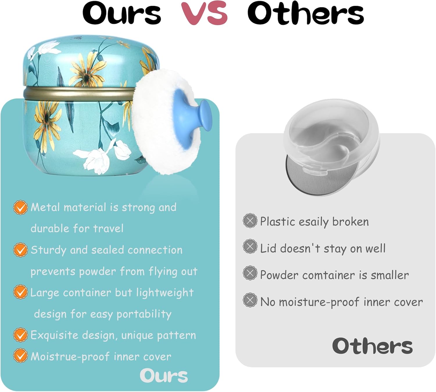 - The powder box has a delicate appearance and a variety of patterns for you to choose. The powder box is made of high-quality tinplate, which are not easy to break after being dropped, and not fade easily, and can be used for a long time. There is also a lid inside the powder box, so you don't have to worry about spilling powder.