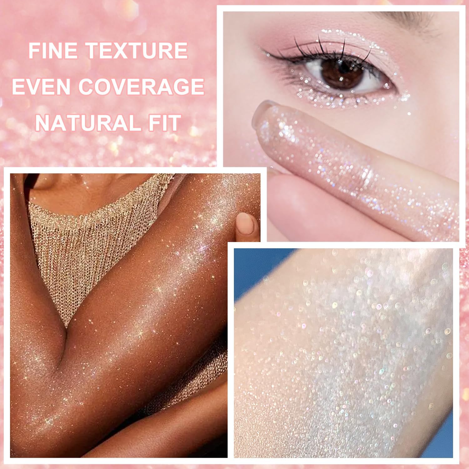 - Glitter Highlighter Powder - The extra finest powder super easy to apply and adheres well to the skin, keep glitter makeup last for hours without greasy, won’t crease, cake or clog pores, smooth your skin and natural glow like sunshine.