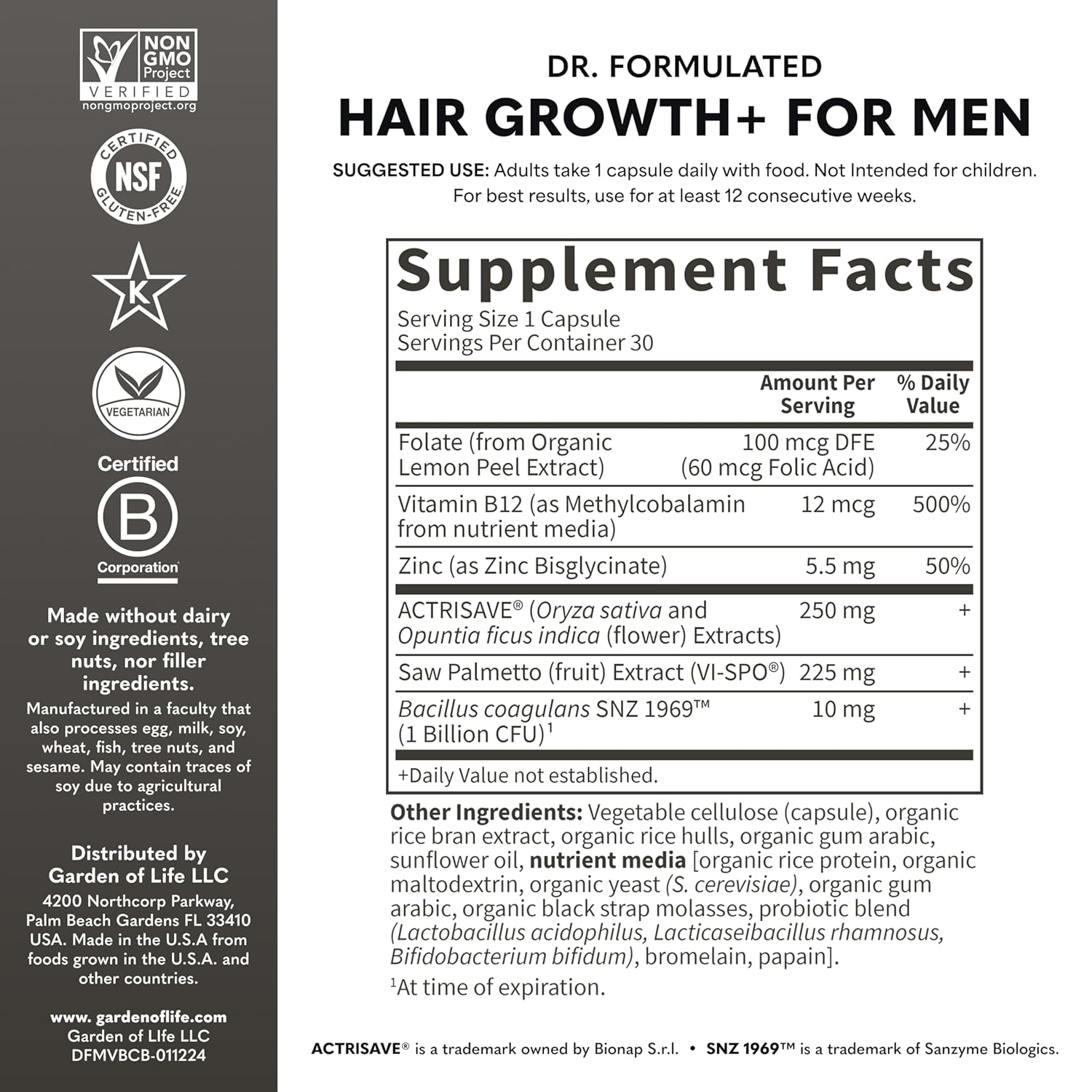 - NON-GMO PROJECT VERIFIED: Dr. Formulated Hair Growth* for Men is Non-GMO Project Verified, NSF Certified Gluten Free, and Vegetarian