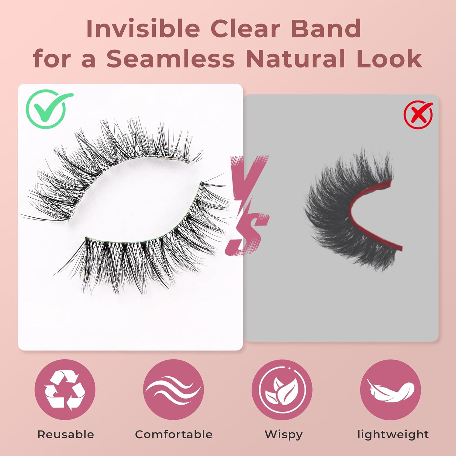 - Clear Band for a Seamless Natural Lash Look: Our invisible clear band blends naturally with your lash line, offering a soft, realistic effect without the harsh black strip. These natural-looking fake eyelashes are perfect for that subtle “no makeup” finish—ideal for office, school, or casual settings