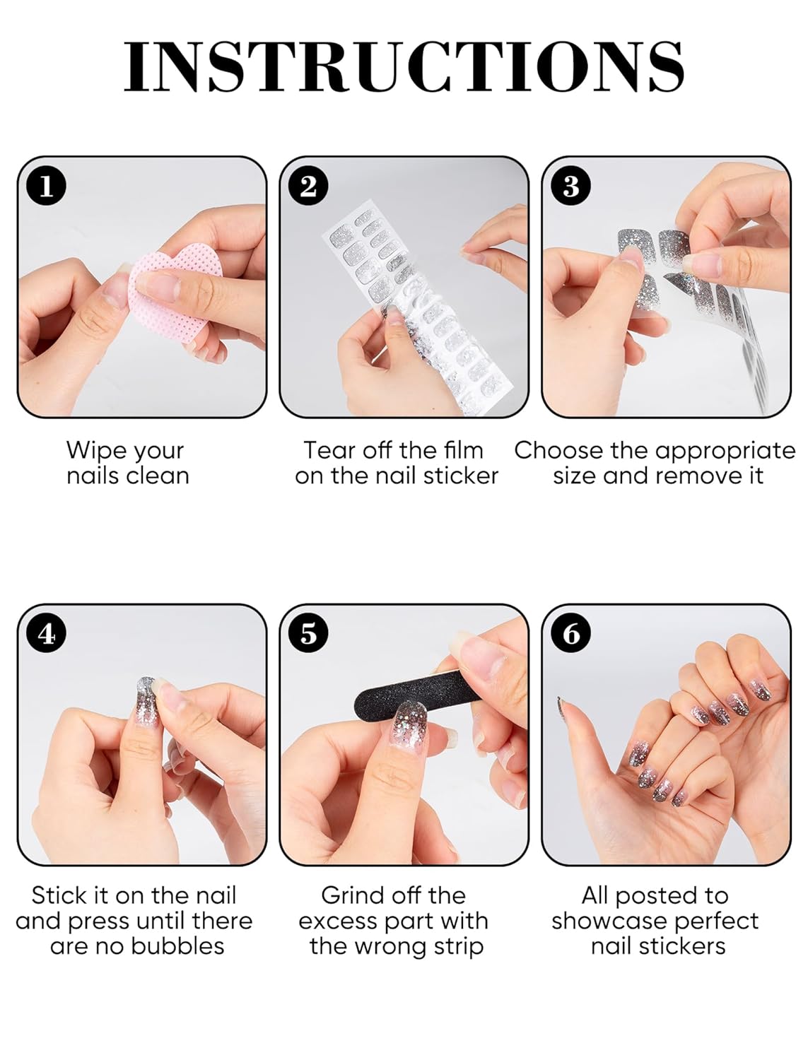 - Easy Application & Removal: No need to buff or polish your nails before application. Simply clean your nails using the provided tools, apply the nail strips, and shape them with the included nail file. Removing them is just as easy—just peel them off without soaking