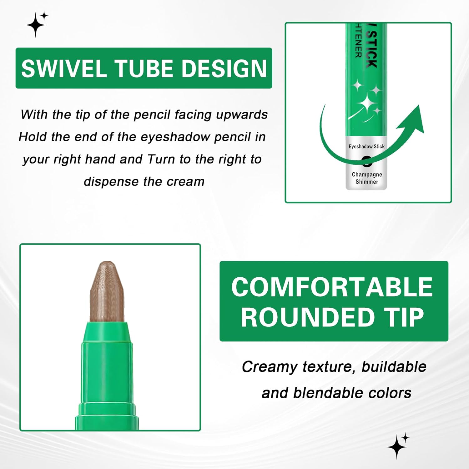- 【Eye Shadow Sticks】8-color eye shadow sticks include 6 shimmering shades of Champagne,Pearl,Taupe,Bronze,Cocoa,Smoky Amethyst and 2 matte shades of Stone and Putty to meet your eye makeup needs