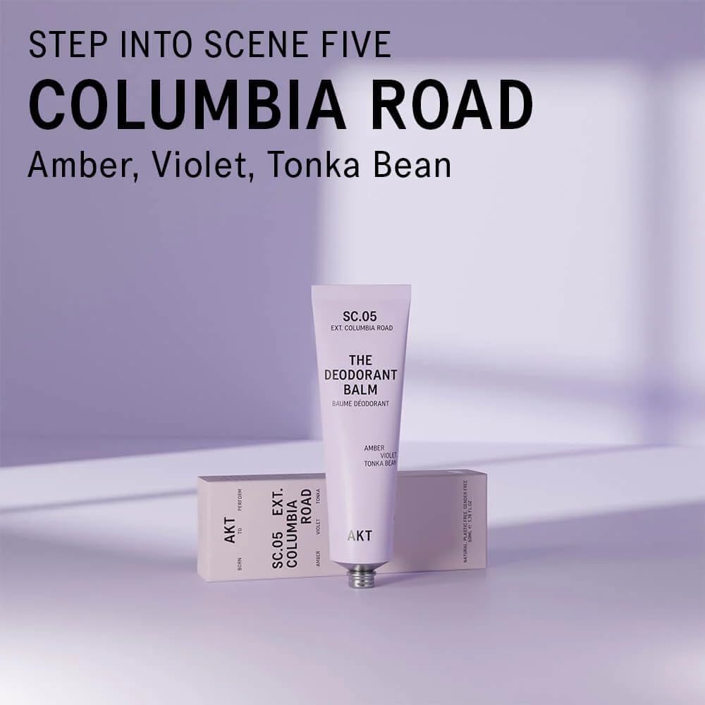 AKT, THE DEODORANT BALM. Award winning, multi-use, natural deodorant. Plastic Free. Gender Free. Aluminium Free. 100% effective — 1 tube lasts up to 3 months. SC.05 COLUMBIA ROAD 50ml/1.76 FL.OZ