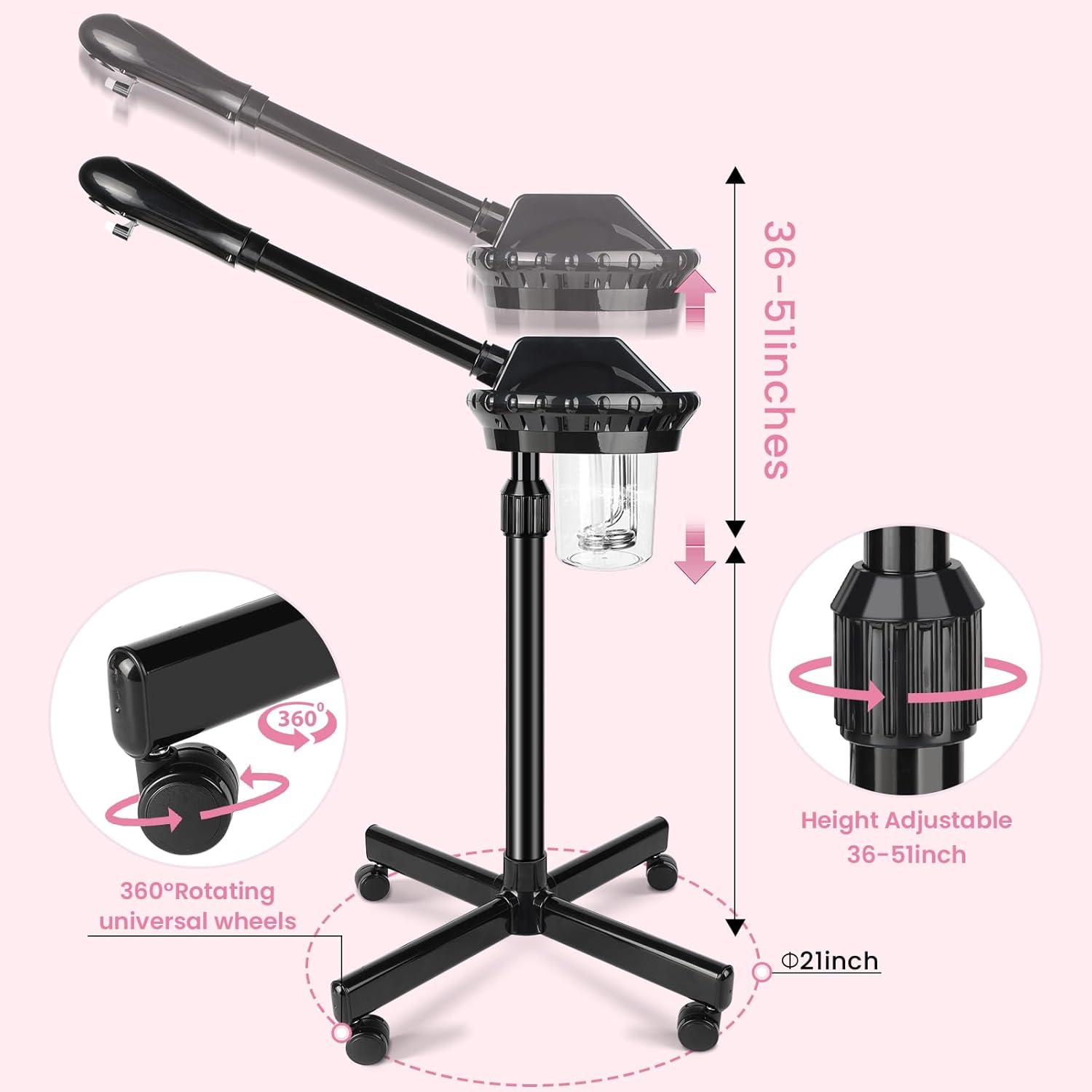 • 【Facial Steamer Professional】Our facial steamer comes with an upgraded atomizing cartridge, more hot mist, 650ml removable water cup, 36-51 inch adjustable height, 360° rotating nozzle and 360° rotating body.