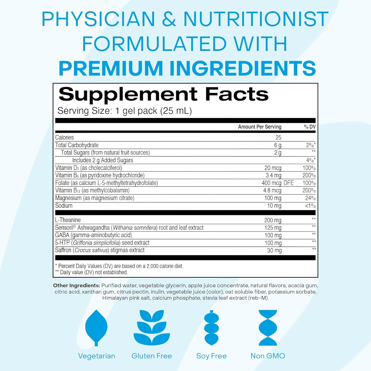 - All-in-One Formula Replaces 8 Pills: The future of vitamins is pill free. This physician and nutritionist formulated gel pack helps you relax with over 663 mg of 5-HTP, L-theanine, magnesium, ashwagandha, GABA, and other relaxing nutrients.