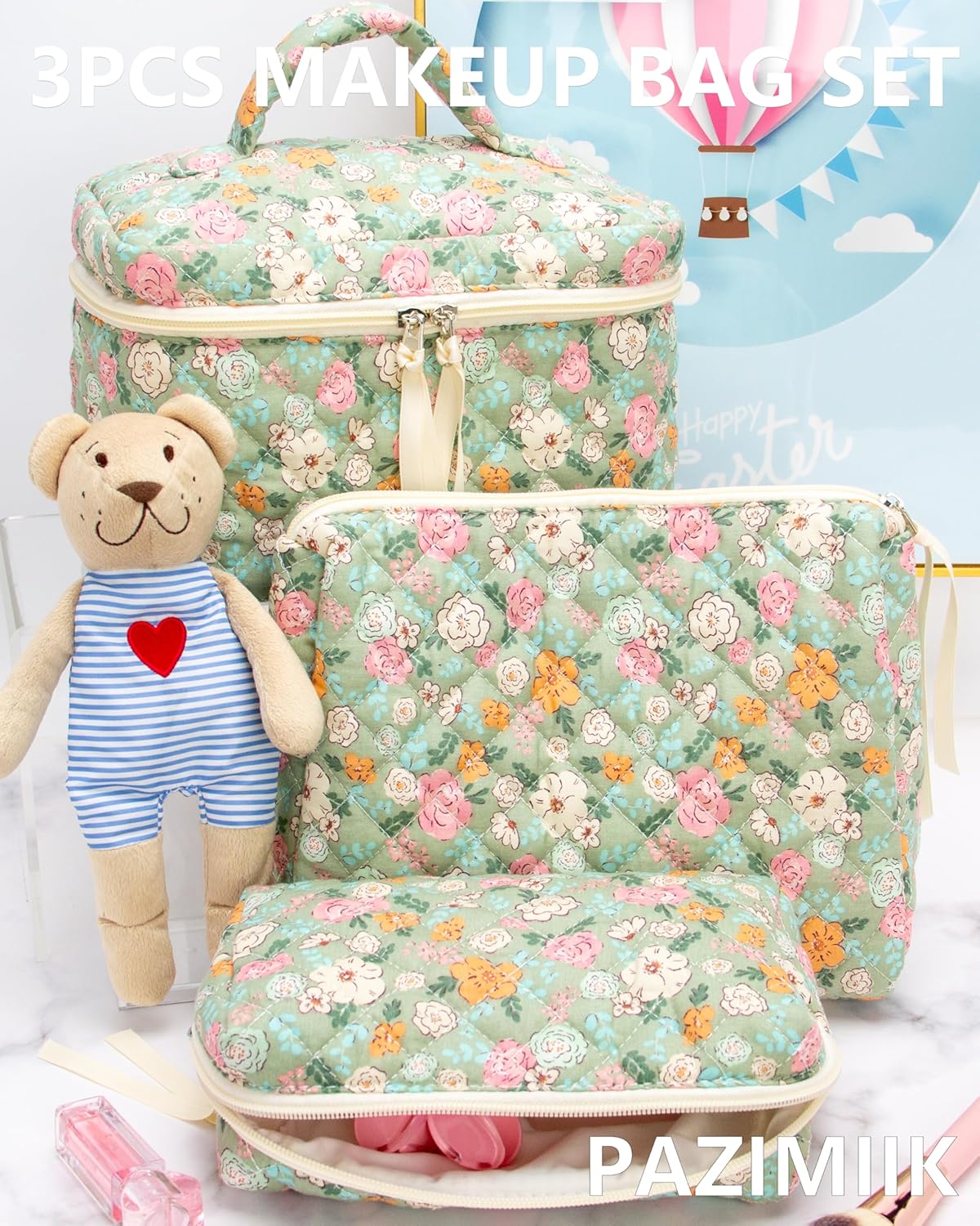 PAZIMIIK 3PCS Makeup Bag SET Large Travel Quilted Zipper Soft Cosmetic Case Pouch for Women Girls Make Up,Green Flower