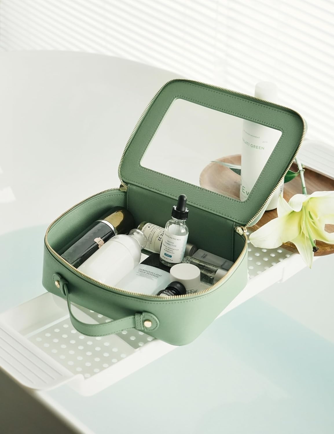 • [Spacious and Roomy] – The green travel make up bag measures 9.6'' x 7.5'' x 3.1'' (24.5cm x 19cm x 8cm), ideal for extended trips or situations where you need to carry a comprehensive collection of makeup and skincare products. It is designed to fit comfortably in suitcases and big travel bags.