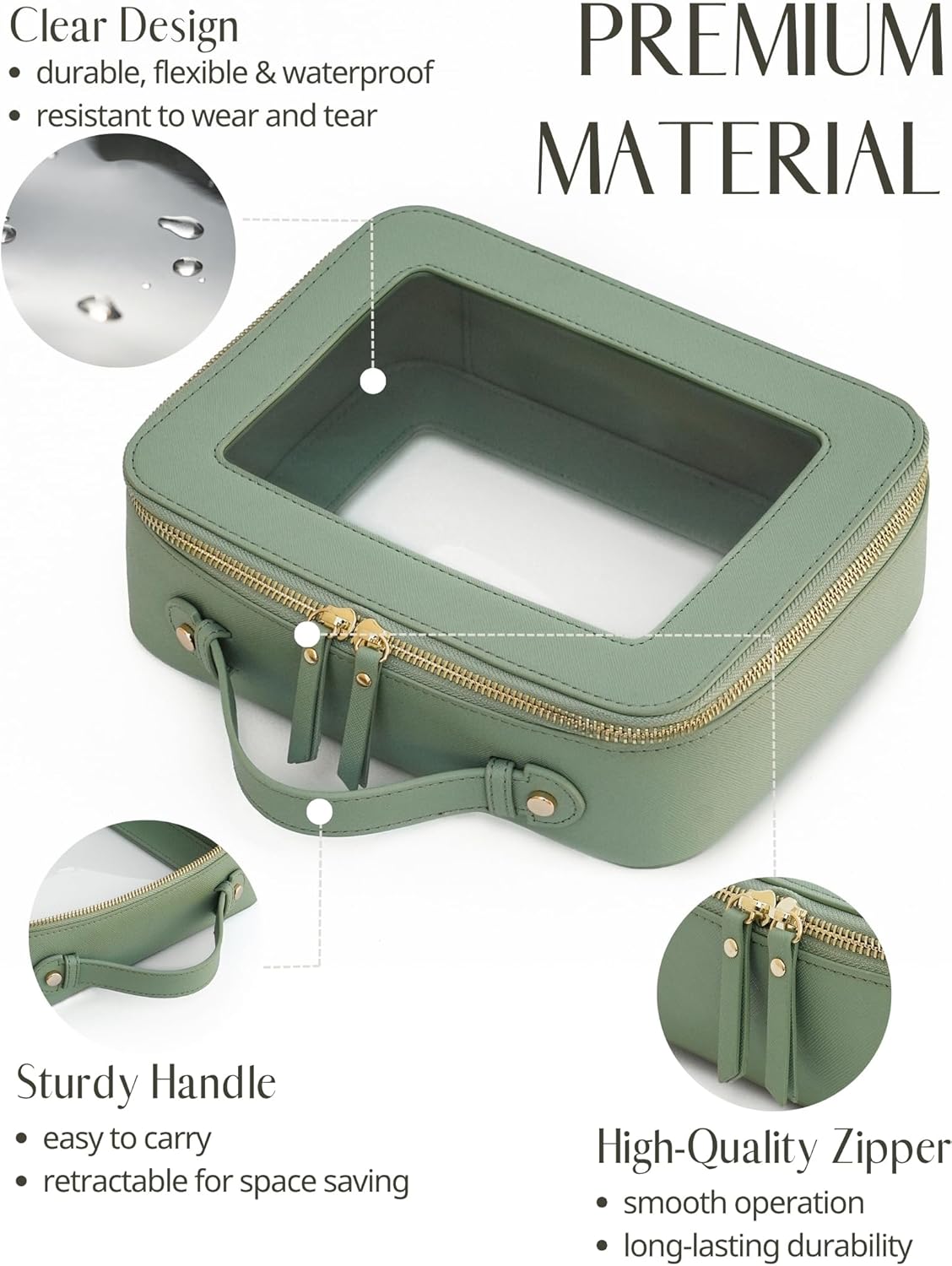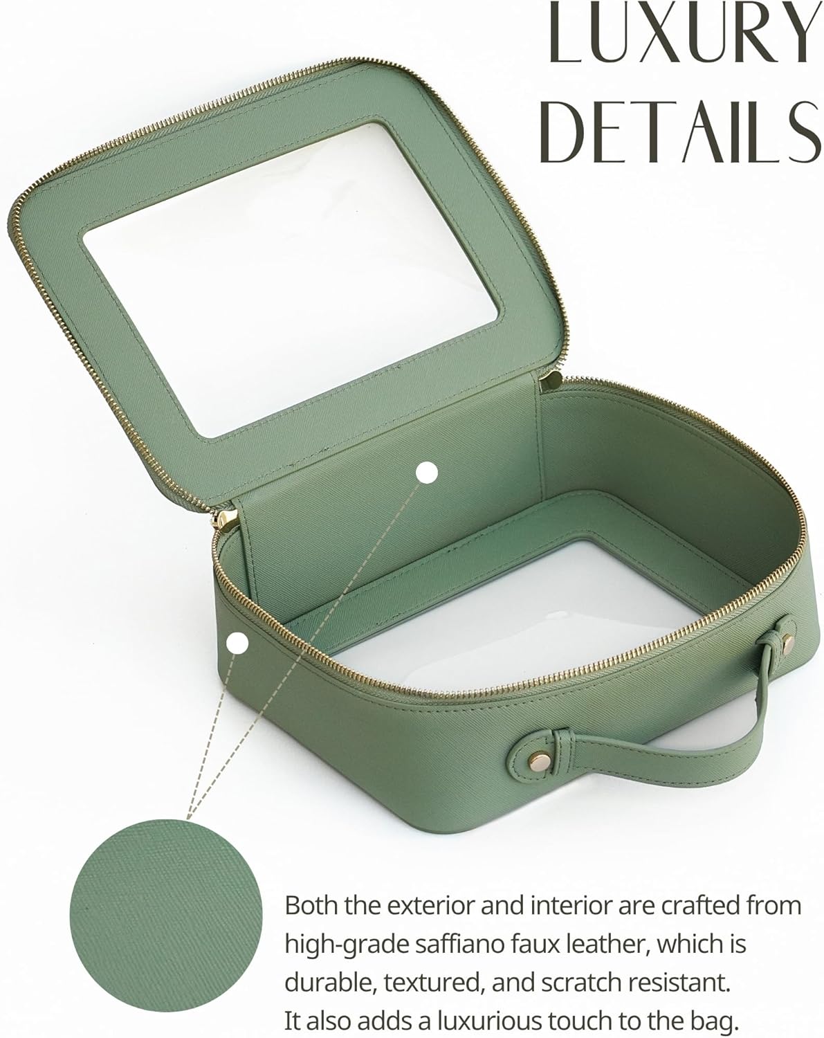 • [Premium Material and Durability] – The clear cosmetic case, both the exterior and interior, is crafted from high-grade saffiano faux leather, which is highly scratch resistant, durable and exceptionally easy to keep clean. It features a smooth zipper for secure closure, and elegant light gold metal hardware accents, adding a luxurious and sophisticated touch to the bag's overall design.