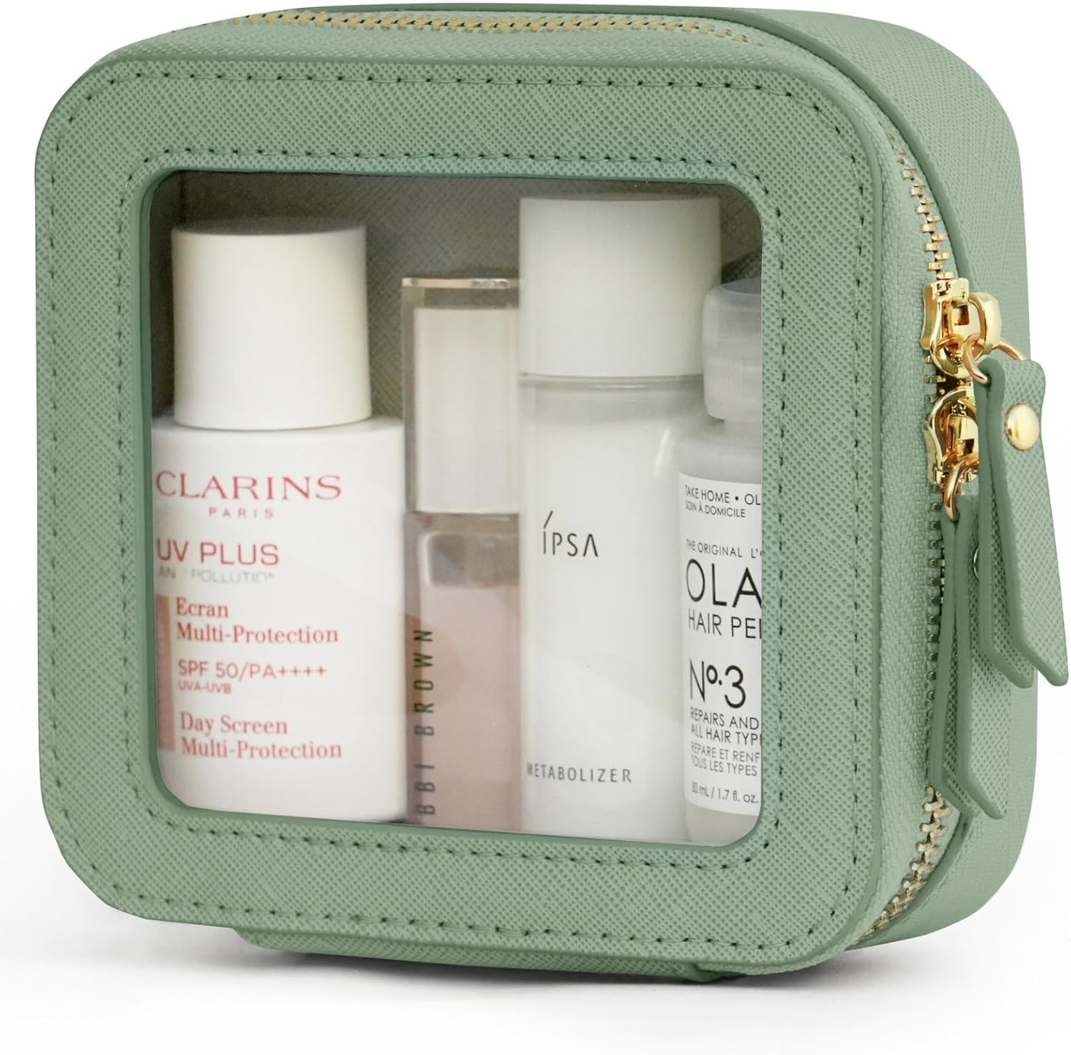 • [Premium Material and Durability] – The clear small cosmetic case, both the exterior and interior, is crafted from high-grade saffiano faux leather, which is highly scratch resistant, durable and exceptionally easy to keep clean. It features a smooth zipper for secure closure, and elegant light gold metal hardware accents, adding a luxurious and sophisticated touch to the bag's overall design.