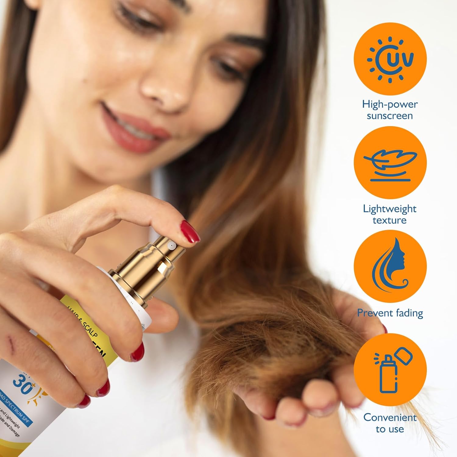 - STRONG SUN PROTECTION: Specially designed for color-treated or permed hair, this ultimate hair & scalp sunscreen spray SPF 30 blocks 98% of UV rays to prevent fading and dryness. Keep your hair shiny and vibrant, whether you’re at the beach or running errands.