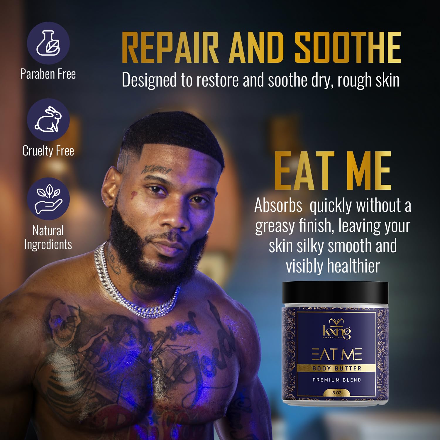 - PHEROMONE INFUSED - Body Butters, Creams, Lotions and Oils for Men by KXNG Cosmetics. Moisturize and nourish All Skin types: extremely dry skin, normal, oily, combination, mature, and sensitive. Organic Raw Shea Butter, Cocoa Butter, Mango Butter, Kokum Butter, Coconut Oil, Body, Hand, Foot.