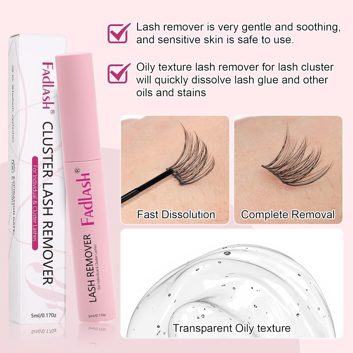 - Dissolve Quickly: FADLASH lash glue remover for clusters are designed with a spiral brush head that can penetrate deep into the root of the cluster lashes, oily texture lash remover for lash cluster will quickly dissolve lash glue and other oils and stains wait for the lash cluster glue dissolve entirely after several minutes, gently wipe off and remove the cluster lashes with a cotton pad.