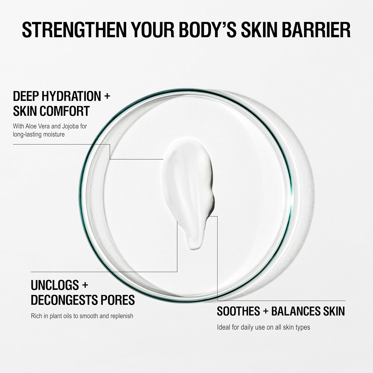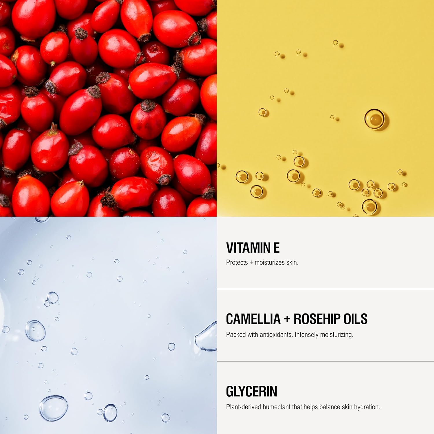 - Fast Absorbing formula. Combines Aloe, Vitamin E & Glycerin, with Geranium & a blend of Camellia, Jojoba & organic Rosehip. Skin looks smooth and plumped with moisture