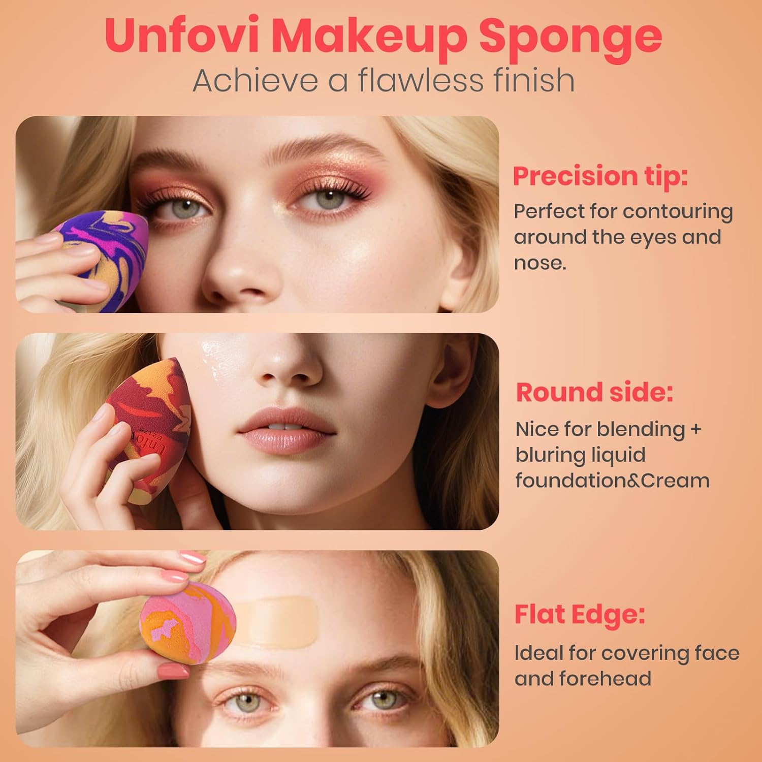 - ✅【Dual Edges Design】Unfovi advanced makeup sponge features a precision tapered tip to easily blend concealer around the inner eye and delicate nasal area, while its angled flat edge seamlessly contours cheekbones, jawline, and forehead for polished look. This multi-functional shape can help achieve streak-free application.