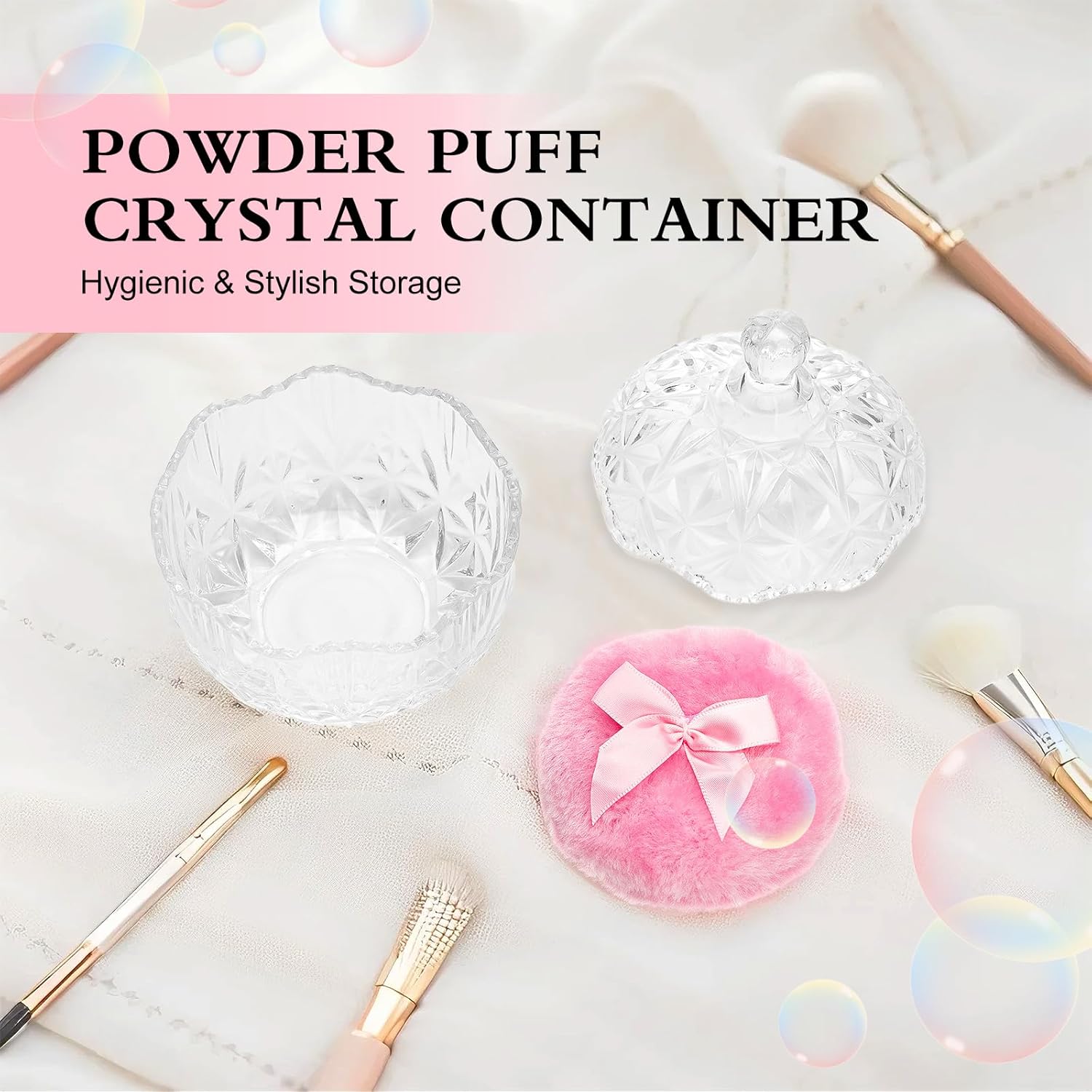 - Gorgeous Design, Premium Quality: This body powder puff and container set features 1 ultra-soft, skin-friendly powder puffs and a crystal-clear glass powder puff container. With a vintage-chic look, it adds elegance to your beauty routine. Note: Not a sealed container