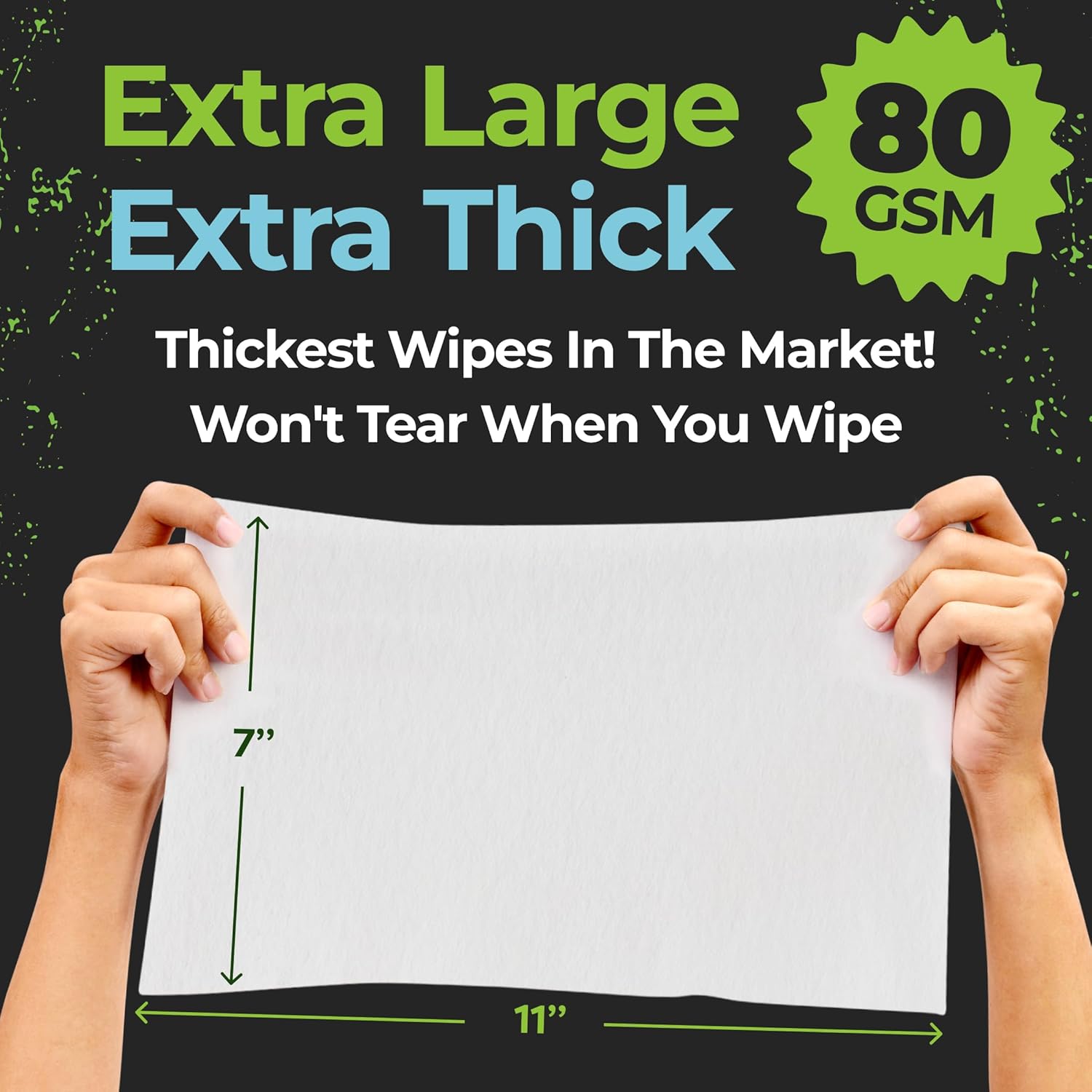 - Get Full-Body Coverage with Extra Large and Extra Thick Disposable Bath Wipes for Adults Bathing No Rinse. Measuring 7x11” and boasting 80 GSM thickness, these camping gear body wipes are strong disposable washcloths that won't tear during use. A durable & reliable hygiene solution for hiking gear kits, backpacking adventures, emergency kits, or when water access is limited. Ideal for rugged use and maximum comfort.