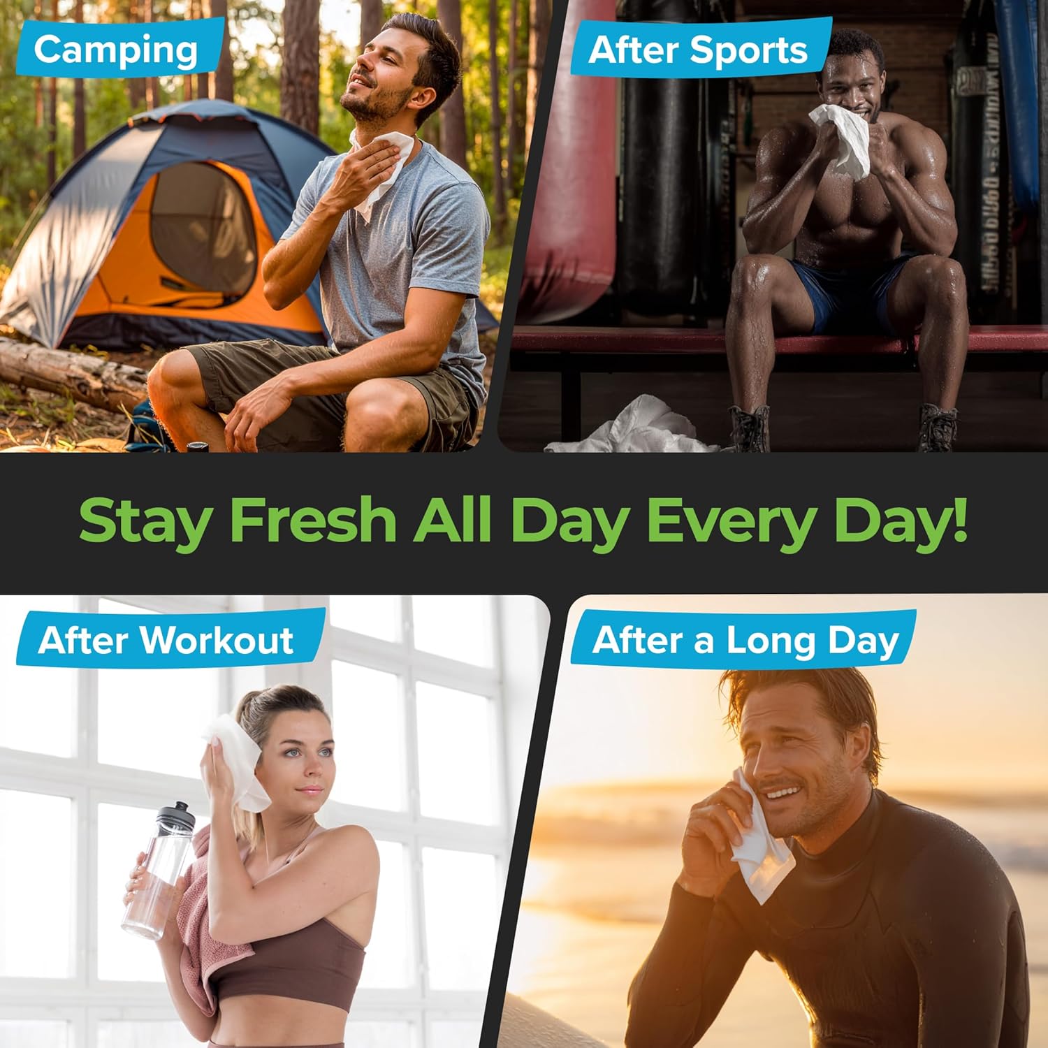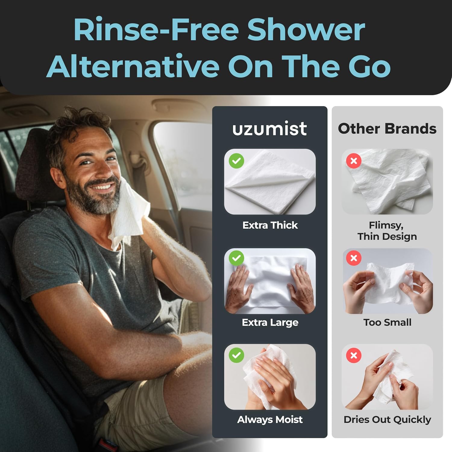 - Stay Clean Anytime with Body Wipes for Camping - Perfect for Refreshing Skin Without Water. Each camping body wipes pack contains 50 XL wet shower wipes that are ultra thick and ideal for quick body hygiene. These full body wipes for adults bathing no rinse are must have camping essentials for personal hygiene. Super refreshing after sports, workouts, hiking or any physical activity. A convenient, portable shower alternative for daily freshness on the go.