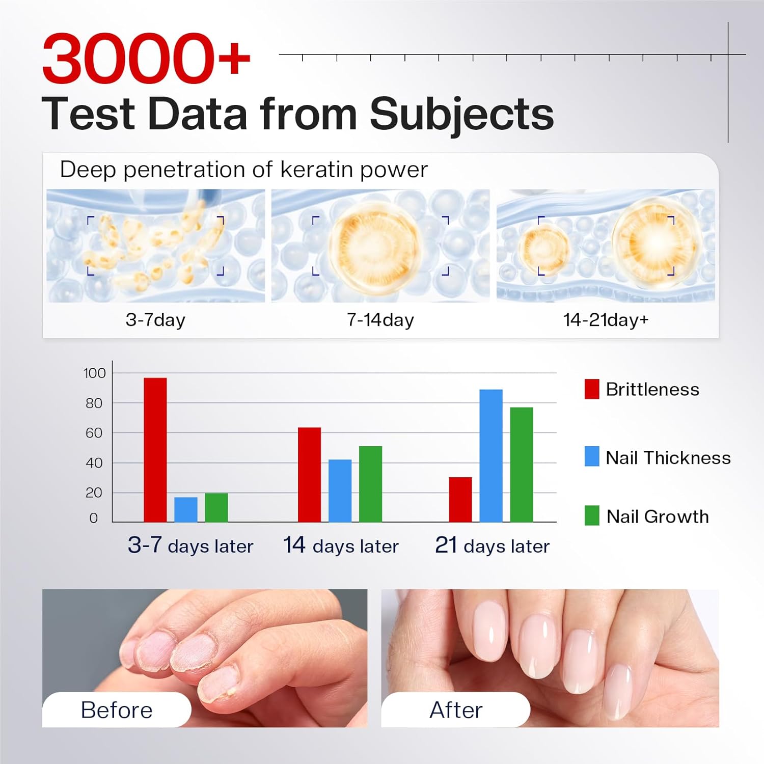 - Nail Hardener: Tested 10w+ samples, effectively proved to nail strengthen for damaged nails, nail repair, add “calcium” to improve work, housework, remove nail art caused by thin, brittle, cracked nails, reduce discoloration, make nails smooth, and back to nails health.