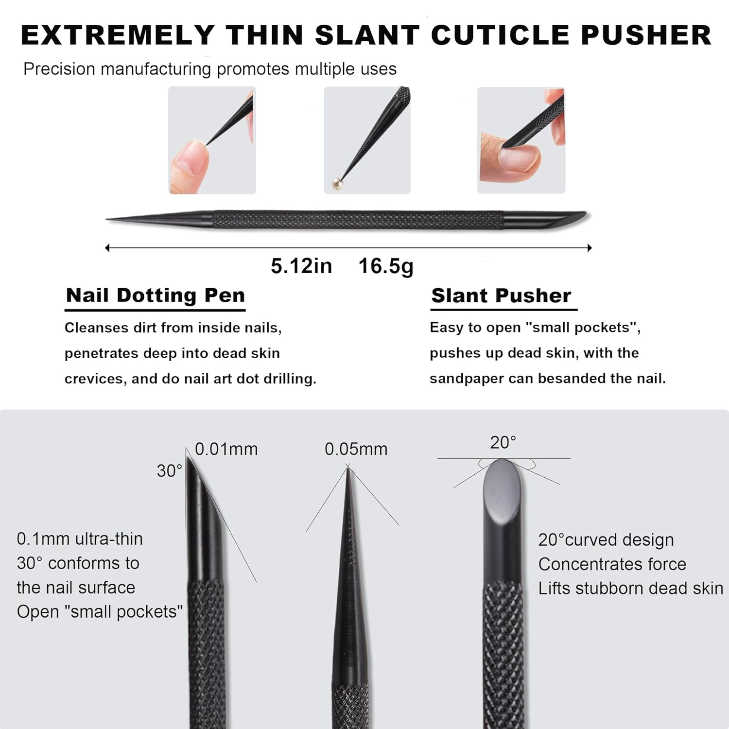 - Classic General Purpose - The cuticle nipper has effective 7mm jaw cuticle nipper design for precise cutting of hangnails and ragged cuticles. Loop pusher can push up cuticles easily and remove polish gel, and the slant pusher easily open the "small pockets" and can use with sandpaper for filing nails. Pointed cuticle pusher is effective in cleaning hard-to-reach places around and under the nail or nail dotting pen, can use with nail polish cleaning cotton to remove excess nail polish glue.