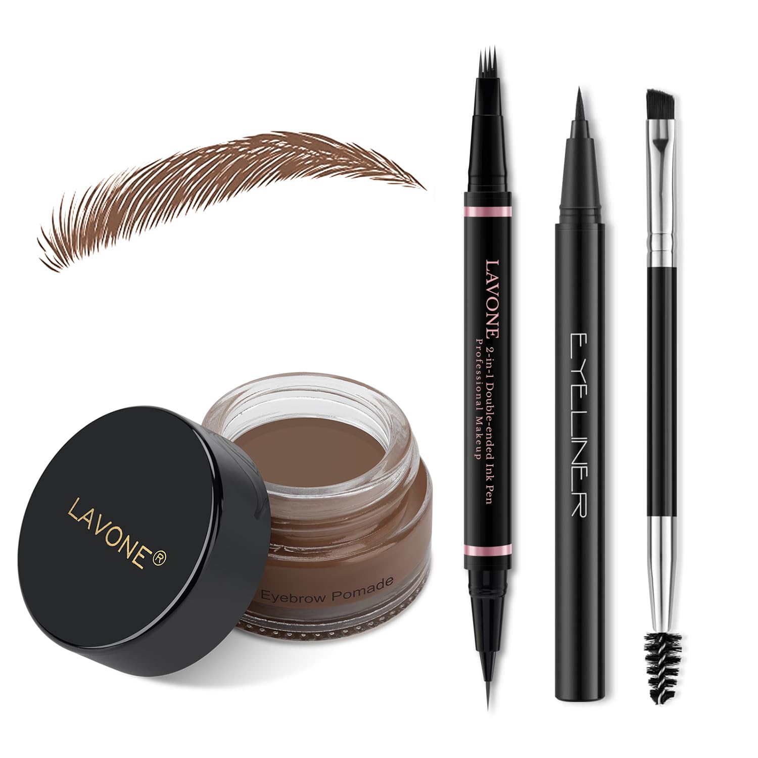- 【What You Can Get】: LAVONE brow pen make up eyebrow kit includes brow pencil (color: brunette), brow pomade (color: brunette), eyeliner (color: black) and dual-ended eyebrow brush. The microblading brow pencil kit with a zipper pouch for on the go.