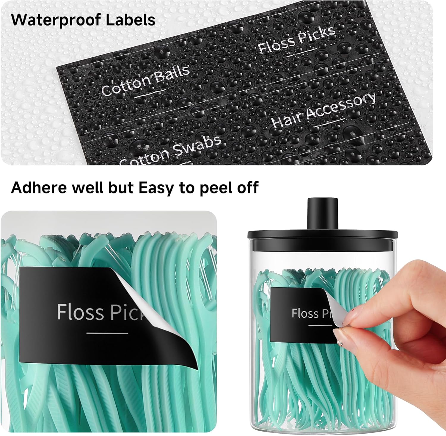 - What’s Included: 4 Glass q tip holder dispensers with lids + 8 transparent labels +8 Black Labels