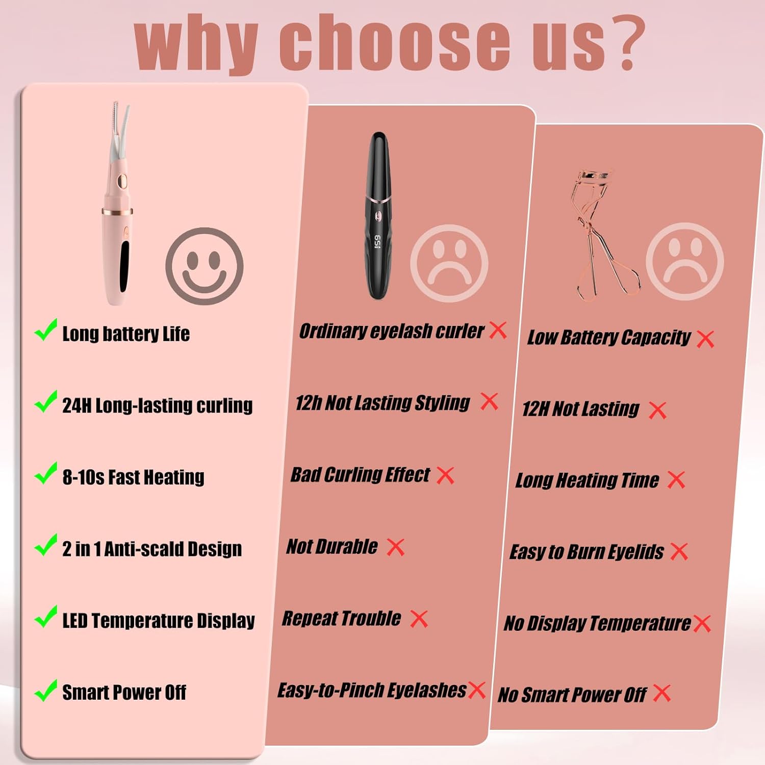 - Adjust Temperature Mode - Our heated eye lash curler comes with 3 temperature settings from 150°F to 190°F to gently curl your lashes and create stunning curls for amazing curling effect for different types of eyelashes, will not frizzing or pinching them