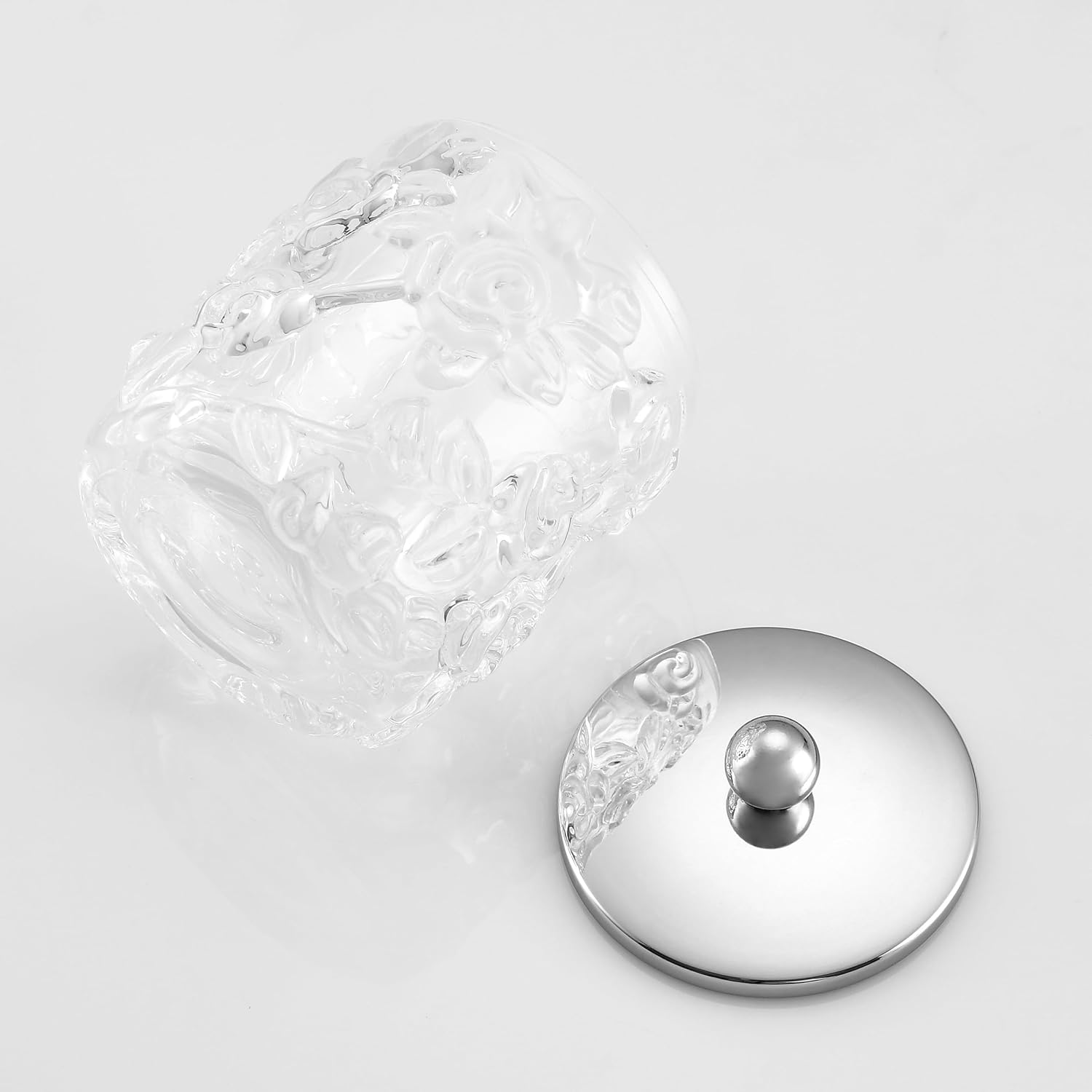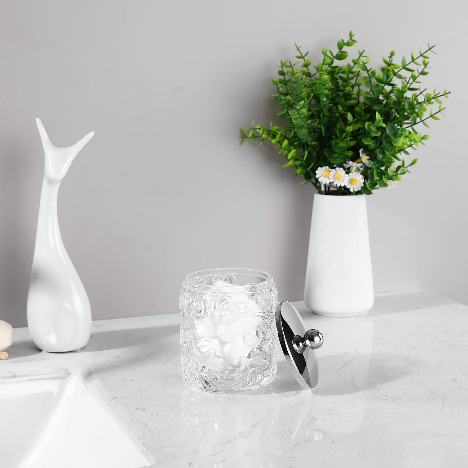 Home Glass Cotton Jar Holder Silver Lid, Elegant Bathroom Storage Canister for Qtips, Cotton Balls, Floss, Makeup Organizer, Vanity Bathroom Organization