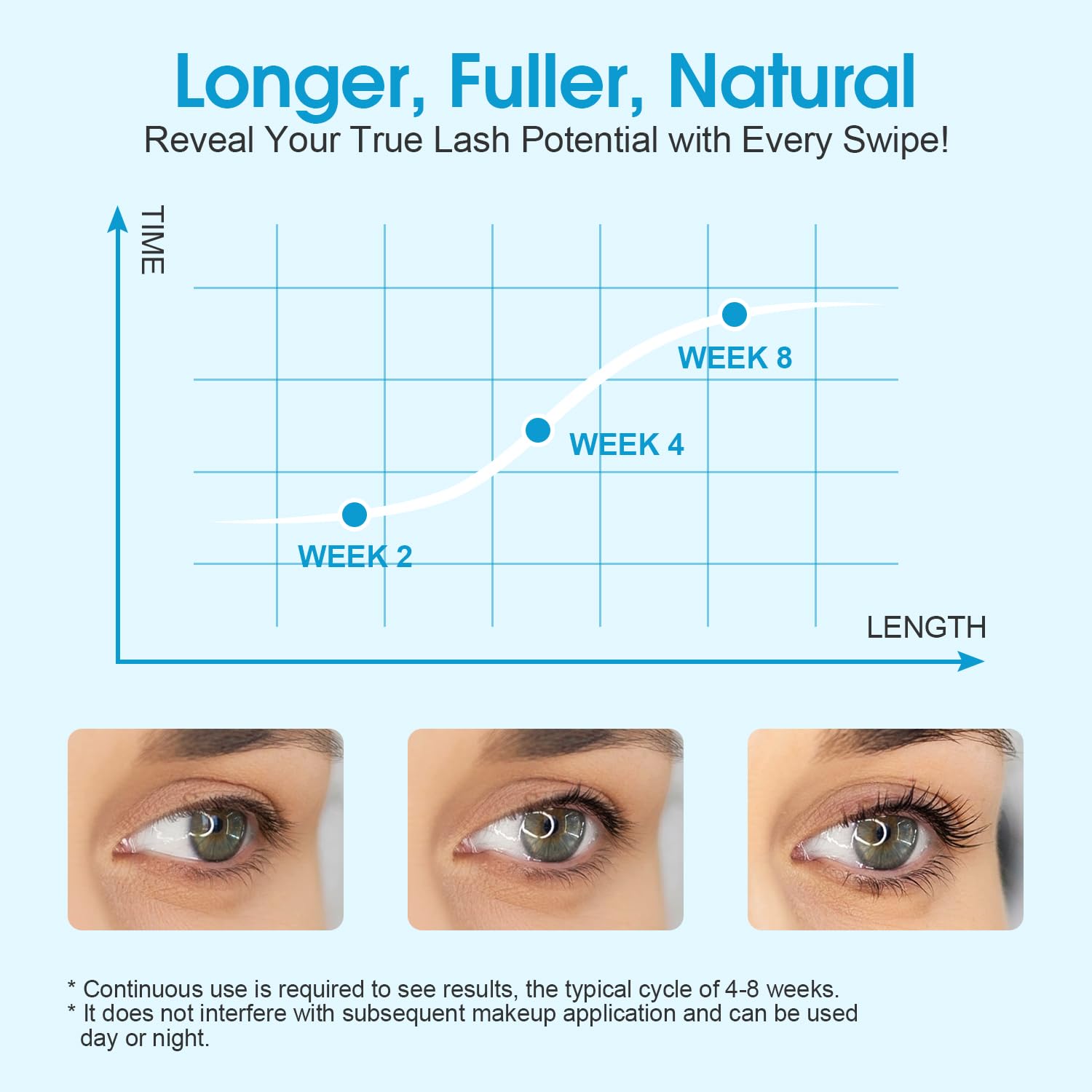- Gradual change: Week 1: Nourishes and awakens dormant follicles. WEEK 2: Strengthens lashes for a healthy shine while minimizing shedding. Week 3: You'll notice longer lashes. For best results, use for at least 30 days, as lashes are one of the slowest growing hairs in the body