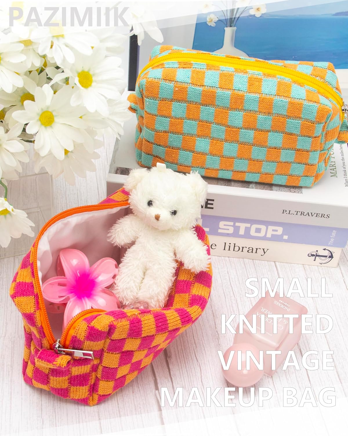 PAZIMIIK Checkered Makeup Bag for Purse Portable Zipper Make Up Pouch Small Cosmetic Case for Travel Red Orange