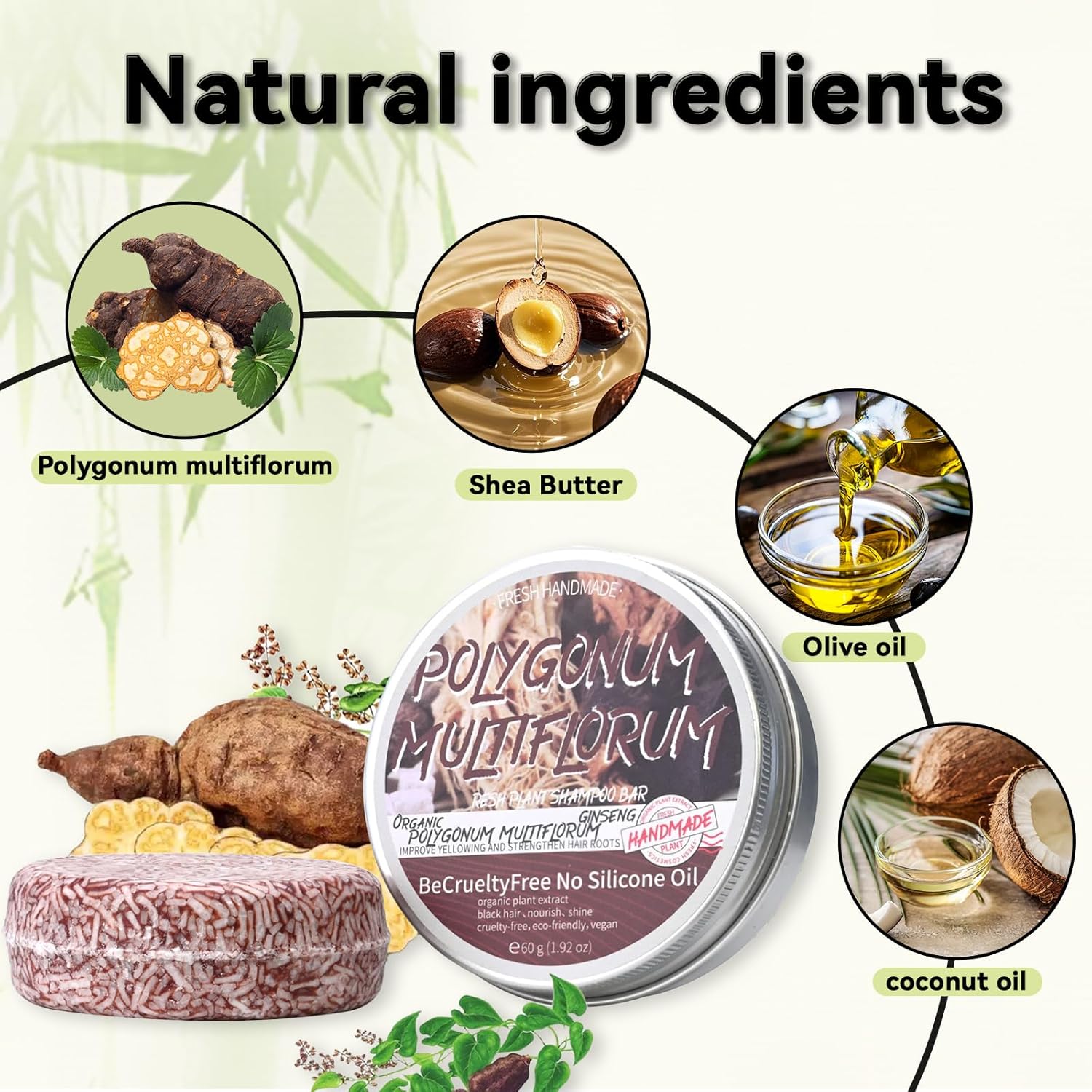 - 【Safe Ingredients】Shouwu Blackening Shampoo Bar uses pure natural ingredients, including shouwu blackening extract, shea butter, olive oil, coconut oil, and other ingredients. It has a mild effect and does not hurt the scalp. Therefore, you can use it with confidence even if you have sensitive skin.