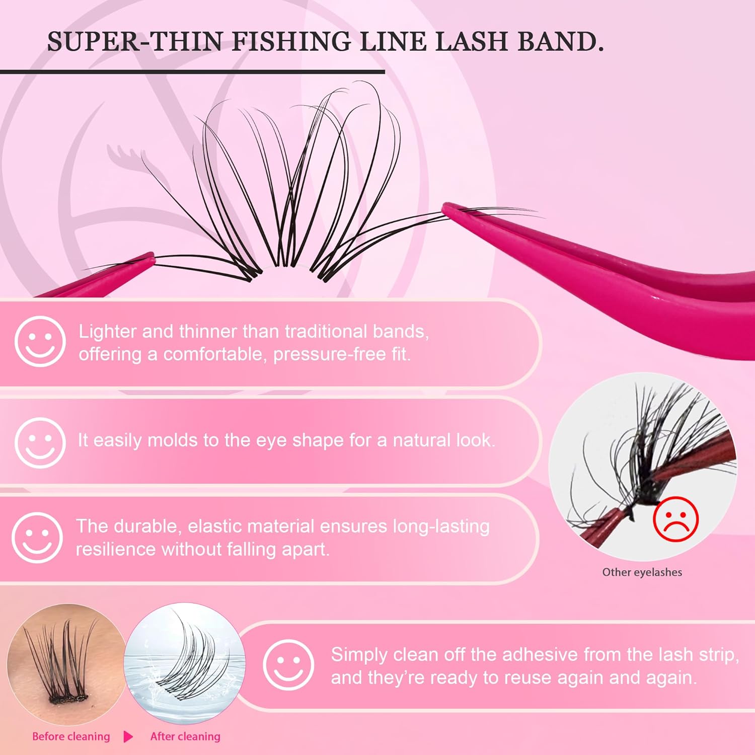 - 【0.05mm Ultra-Invisible Eyelash Band】Crafted with 30 refined processes and meticulously hand-cut for the perfect length in every cluster, it easily molds to the eye shape for a natural look. The ultra-thin 0.05mm super-thin fishing line lash band is flexible and molds perfectly to your eyelid, providing a seamless, natural fit.Elastic fibers allow for easy reshaping. Reusable and resilient, these lashes bounce back to their original form after every use, ensuring long-lasting wear. Simply clean off the adhesive from the lash strip, and they’re ready to reuse again and again.