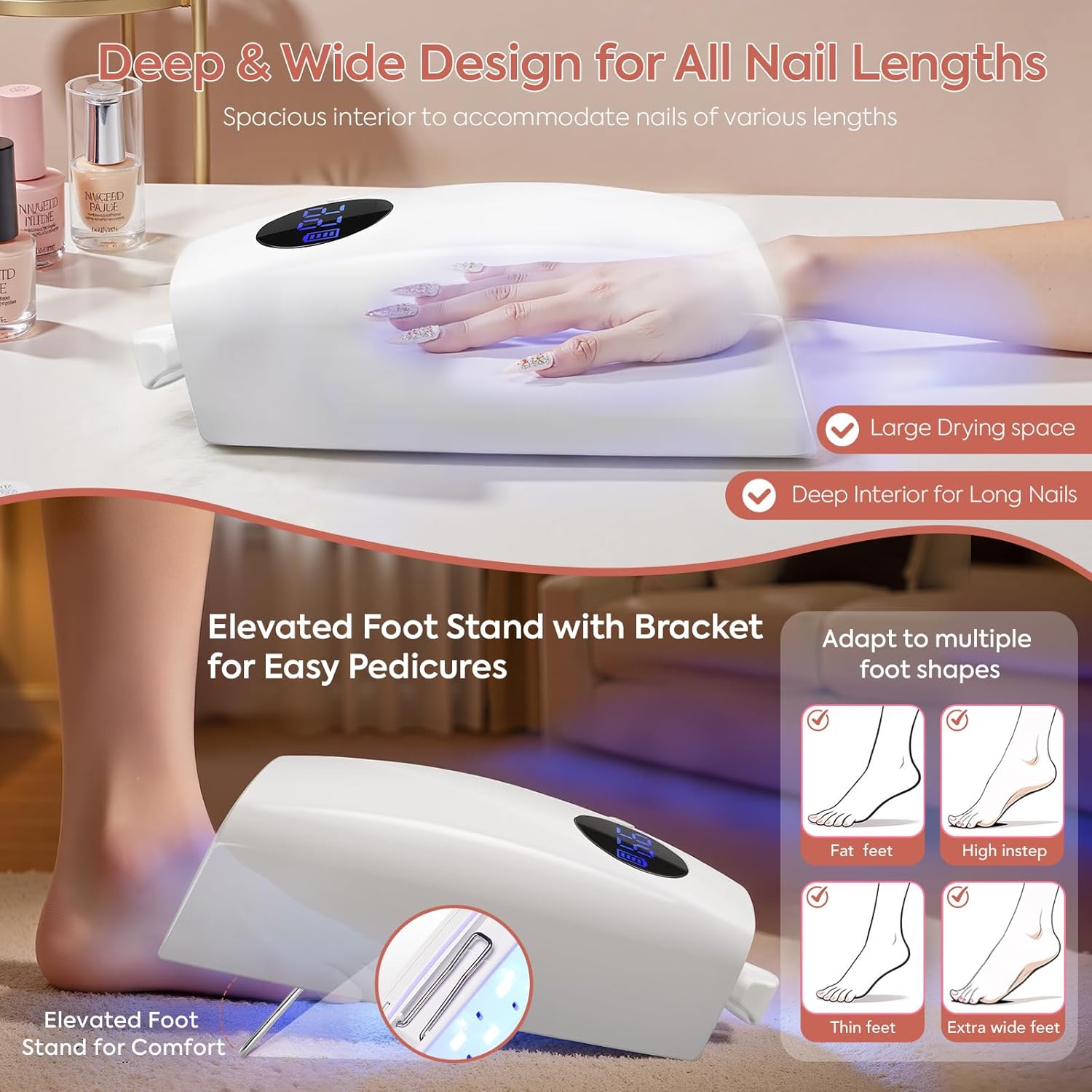- Raised & Retractable Foot Stand - Spacious elevated UV light for gel nails fits all foot sizes and shapes, including high arches, wide feet, long toes, and flat feet, providing a more comfortable curing experience for toenails or fingernails.